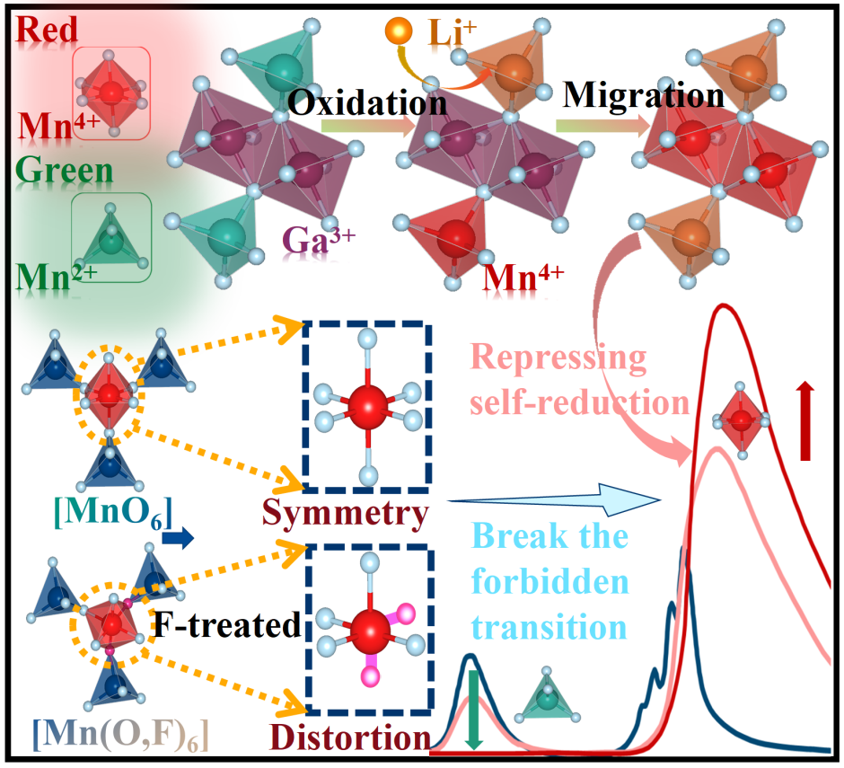 Mn-activated phosphors have attracted great attention, but the inevitable self-reduction of Mn4+ to Mn2+ and precise regulation of Mn4+/Mn2+ content remain serious challenges. Herein, through solid-state reaction in air, we demonstrate that the degree of self-reduction and valence of Mn can be accurately manipulated in normal spinel ZnGa2O4 (ZGO) by incorporation of Li+ and F-, achieving color-tunable photoluminescence (PL) as desired, from blue self-luminescence to red/green emission of Mn4+/Mn2+. Both theoretical (i.e., density functional theory, bond energy theory) and experimental (i.e., dynamic/static spectroscopy) analyses indicate that Li+ occupying the tetrahedral Zn2+ site can push Mn4+ into the octahedral Ga3+ site and restrain self-reduction of Mn4+ owing to localized charge accumulation around Li+ that depletes excess electrons. Furthermore, F− substitution can repair intrinsic oxygen vacancies, further suppressing self-reduction and detrimental electron-capturing effects. Meanwhile, Li+/F− incorporation can distort ZGO and break the forbidden transition of Mn4+, leading to broadened PL and enhanced efficiency. The long-persistent PL (LPL) of ZGO: Mn/Li/F with wide shallow/deep traps is also explored in depth. Finally, the Li/F-dependent tunable PL and LPL of ZGO: Mn/Li/F show great potential for applications in ratiometric optical thermometers, plant lighting, white LEDs, and dynamic anticounterfeiting.
