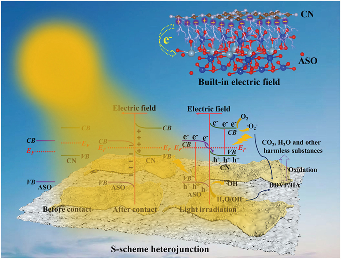 As food safety concerns grow, controlling organophosphorus pesticide residues and food spoilage substances has become a priority. Effectively degrading contaminants like dichlorvos (DDVP) on chili peppers and histamine (HA) in sardines is crucial for food safety. This study explores the rapid degradation and mechanism of DDVP on chili pepper surfaces and HA in sardines using S-scheme Al6Si2O13/g-C3N4 (ASO/CN) nanocomposites. Rapid detection methods analyzed standard solutions of DDVP and HA. The synthesized ASO/CN nanocomposites showed excellent photocatalytic activity, reducing DDVP from 100% to 17.7% in 100 min, outperforming individual ASO and CN. The catalyst maintained high degradation efficiency over five cycles (500 min). The ASO/CN nanocomposites also degraded HA in sardines, lowering it from 100% to 9.2% in 70 min, with stable performance over five cycles (350 min). Characterization techniques, including in situ X-ray photoelectron spectroscopy (XPS), Kelvin probe force microscopy (KPFM), femtosecond transient absorption spectroscopy (fs-TAS), and differential charge density calculations, confirmed an S-scheme photocatalytic mechanism that enhanced radical formation. Based on these findings, practical tests under natural conditions were conducted. The catalyst reduced DDVP on chili peppers from 100% to 39.2% over seven days, outperforming the control (100% to 78%). In sardines, HA in the ASO/CN-treated group increased from 25.1% to 71.6% over five days, while the untreated group increased from 25% to 90.5%. These results offer a new approach for organophosphorus pesticide degradation and meat preservation.