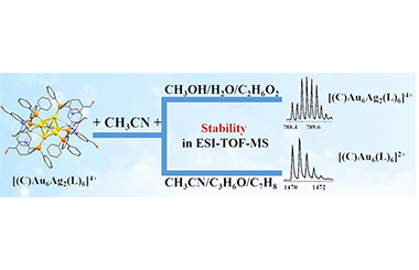 Electrospray ionization time-of-flight mass spectrometry (ESI-TOF-MS) has been recognized as a powerful technique for studying metal clusters’ chemical composition and reaction mechanisms. It is a great challenge in mass spectrometry analysis to maintain the metal cluster molecules intact without fragmentation, which is achieved in this work by using mixed solvents to change the interaction between cluster molecules and solvent molecules, further affecting the fragmentation behaviors of the metal cluster in MS. Theoretical analysis reveals that the stability of the [(C)Au6Ag2(C18H14ONP)6]4+ cluster in ESI-TOF-MS is related to the strength of the chemical bonds between its own atoms and the bonding between the solvent and the cluster molecules.