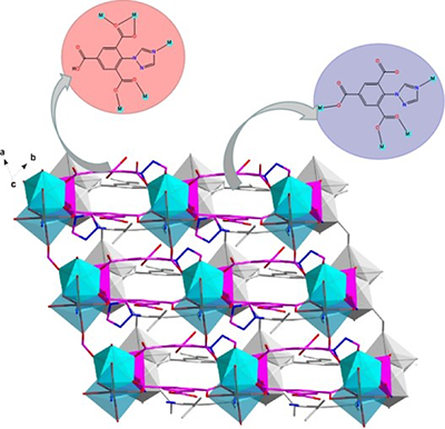 With triazole-modified derivative as link, one new framework [Cd5 (μ5 -HL2-)2(μ4 -L3-)2(H2O)10]·2H2O(1, H3L = 2-(1,2,4-triazol-1-yl)benzene-1,3,5-tricarboxylic acid) has been hydrothermally synthesized and characterized by single-crystal X-ray diffraction, powder X-ray diffraction and elemental analysis. Complex 1 exhibits a 3D (3,4,6)-connected net cross-linked by binuclear [Cd2(COO)5]- cluster and mononuclear Cd(II) geometry via HL2-/L3- ligands. It crystallizes in triclinic system, space group P1- with a = 7.7411(11), b = 9.8813(15), c = 20.177(3) Å, α = 85.547(4)°, β = 80.603(4)°, γ = 67.976(3)°, V = 1411.3(4) Å3 , Z = 1, Mr = 1876.89 g/mol, Dc = 2.208 mg/m3 , μ = 1.97 mm-1, F(000) = 918, GOOF = 1.03, the final R = 0.0869 and wR = 0.1950 for 3127 observed reflections with I > 2σ(I). The solid photoluminescent behaviour of 1 has been further functionally investigated.