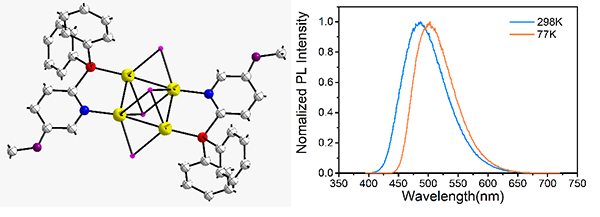 In solid state, this complex exhibits efficient blue emission with a photoluminescence quantum yield of 43.3% and a decay time of 19 μs at room temperature. The