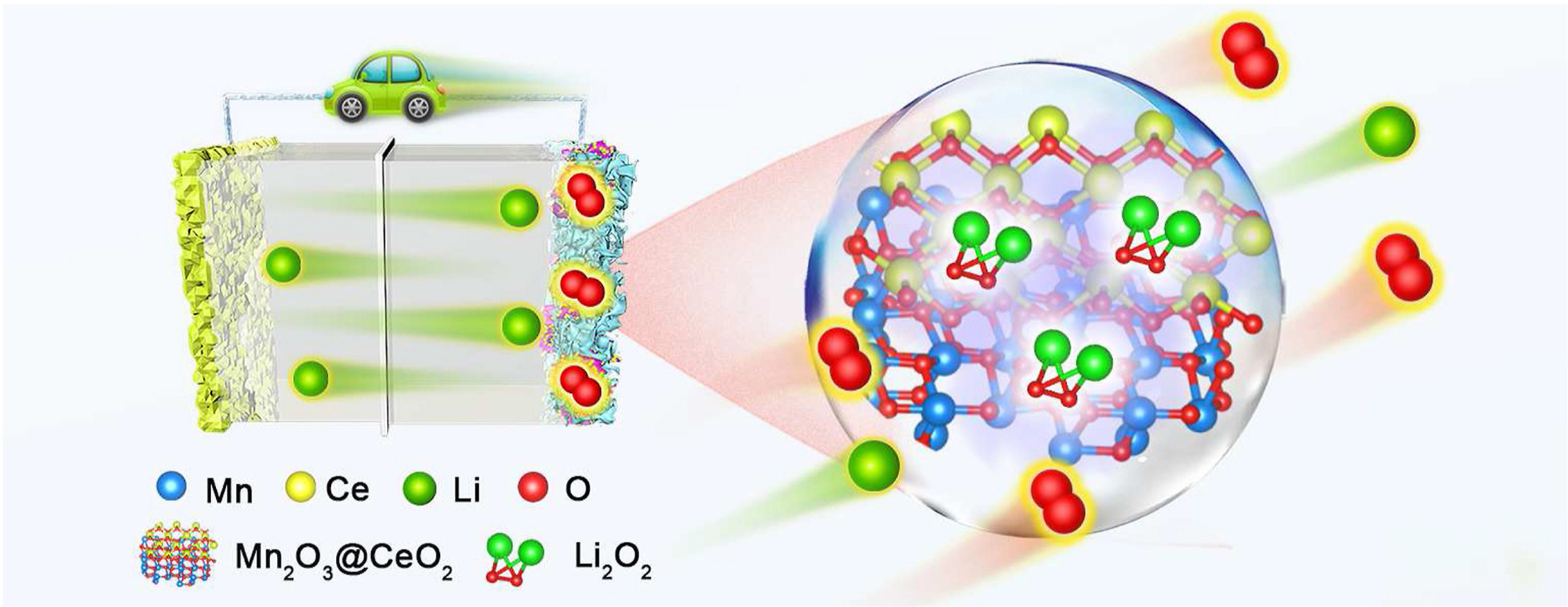 The application of Li–O2batteries (LOBs) with ultra-high theoretical energy density is limited due to the slow redox kinetics and serious side reactions, especially in high-rate cycles. Herein, CeO2 is constructed on the surface of Mn2O3 through an interface engineering strategy, and Mn2O3@CeO2 heterojunction with good activity and stability at high current density is prepared. The interfacial properties of catalyst and formation mechanism of Li2O2 are deeply studied by density functional theory (DFT) and experiments, revealing the charge-discharge reaction mechanism of LOBs. The results show that the strong electron coupling between Mn2O3 and CeO2 can promote the formation of oxygen vacancies. Heterojunction combined with oxygen vacancy can improve the affinity for O2 and LiO2 reaction intermediates, inducing the formation of thin-film Li2O2 with low potential and easy decomposition, thus improving the cycle stability at high current density. Consequently, it achieved a high specific capacity of 12545 at 1000 mA g−1 and good cyclability of 120 cycles at 4000 mA g−1. This work thus sheds light on designing efficient and stable catalysts for LOBs under high current density.