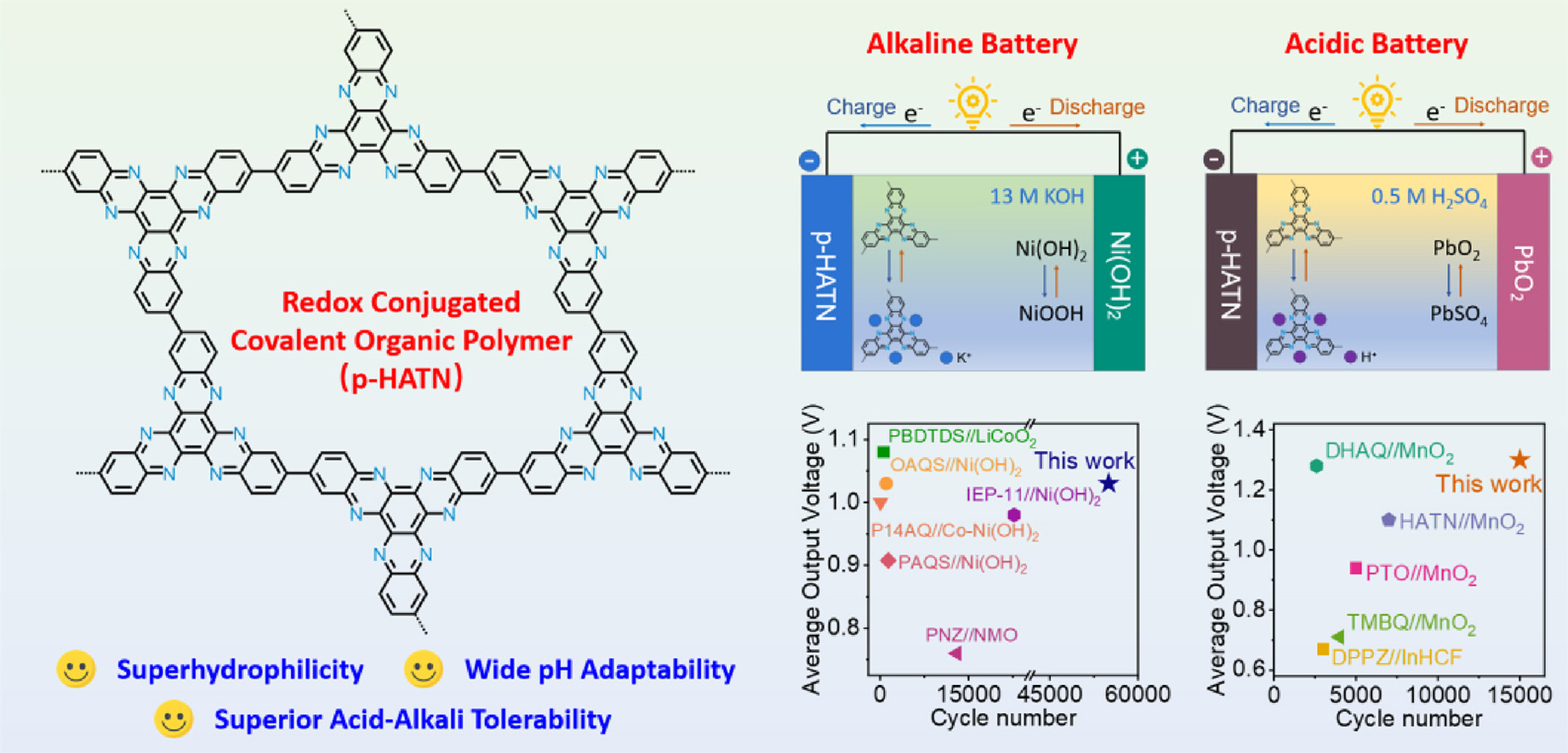 Herein, we introduce a redox conjugated covalent organic polymer (p-HATN, HATN = hexaazatrinaphthylene) anode bearing HATN species for long-lifespan aqueous alkaline and acidic batteries. The p-HATN features intriguing superhydrophilicity and unique wide pH adaptability, while the conjugated network and amorphous cross-linked structure further endow p-HATN with improved electron transport, facile ion diffusion and superior acid-alkali tolerability. As a result, p-HATN exhibits fast surface-controlled redox activity and superior stability for K+ and H+ ions storage with remarkable capacity retentions in three-electrode cells (88% capacity retention in 13 M KOH over 30000 cycles; nearly 100% capacity retention in 0.5 M H2SO4 over 54000 cycles). Moreover, the assembled p-HATN//Ni(OH)2 cell with 13 M KOH and p-HATN//PbO2 cell with 0.5 M H2SO4 also achieve capacity retentions of 83% retention over 55000 cycles and 92% over 15000 cycles, respectively, outperforming most similar systems. This work sheds light on the rational design of advanced polymer anodes for long-lifespan alkaline and acidic batteries.