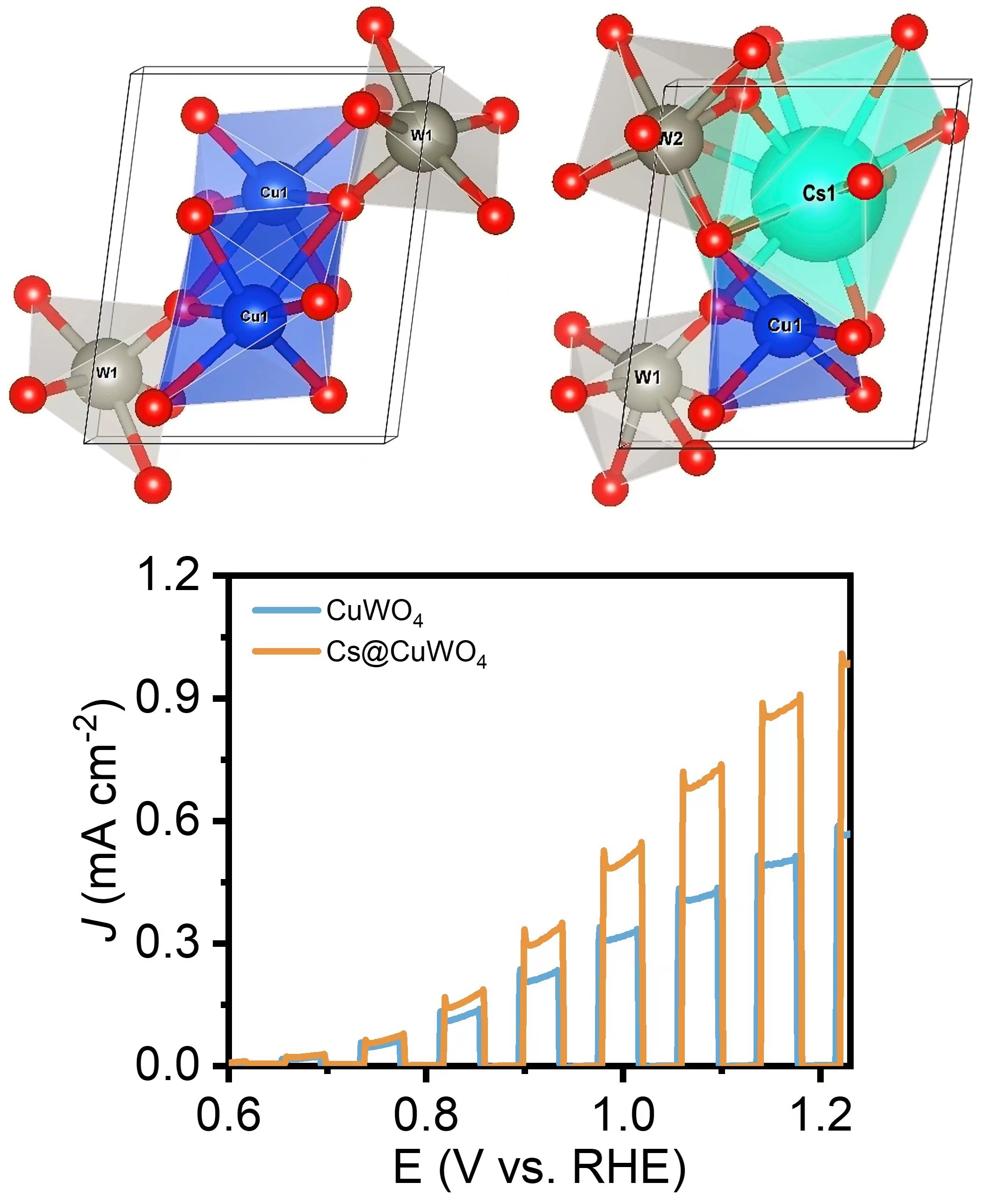 Copper tungstate (CuWO4) is a promising photoanode for photoelectrochemical (PEC) water splitting due to its appropriate energy band position and broad light absorption range. However, the inherent unfilled 3d atomic orbital of Cu acts as a natural electron-hole recombination site, significantly constraining the PEC performance of CuWO4. Herein, Cs atoms with complete atomic orbitals are doped into CuWO4 in order to obtain better bulk charge separation capability. As a result, the photocurrent of Cs@CuWO4 increases from 0.57 to 0.99 mA cm−2 compared to CuWO4 at 1.23 V vs. reversible hydrogen electrode (RHE) under AM 1.5G illumination, as well as the bulk charge transfer efficiencies rising from 13.5% to 19.3%. In addition, density of states (DOS) calculations further prove that the introduction of Cs atoms effectively suppresses the contribution of Cu 3d orbitals at the Fermi level. This work offers a valuable reference for the advancement of CuWO4 as the next-generation PEC photoanode material.