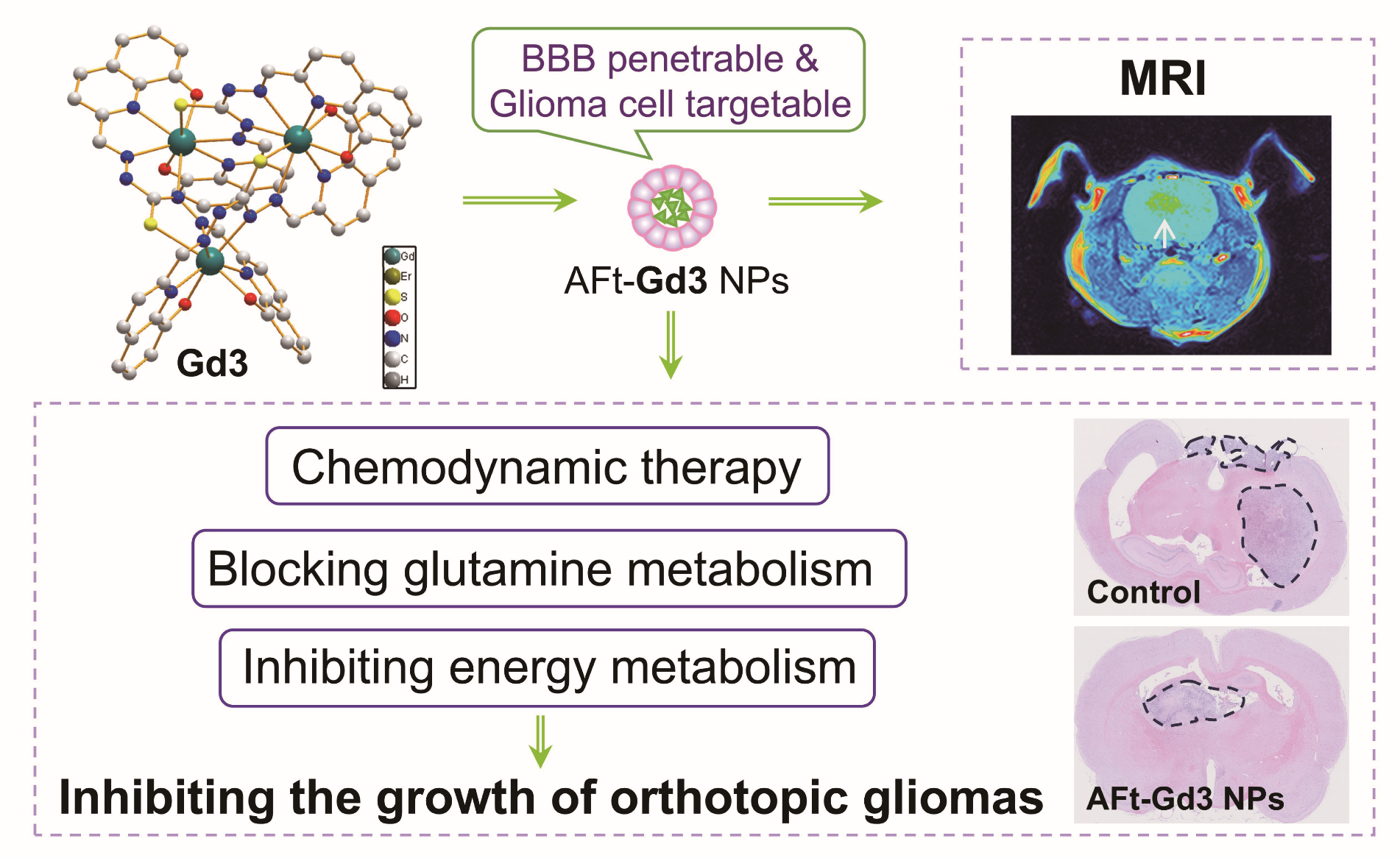 To effectively penetrate the blood‒brain barrier (BBB) and integrate magnetic resonance imaging (MRI) diagnosis and multitarget therapy for orthotopic glioma, we proposed to develop a multinuclear gadolinium (Gd) complex based on apoferritin (AFt). To this end, we rationally designed and synthesized a trinuclear Gd(III) complex (Gd3) with strong T1-weighted MRI performance and remarkable cytotoxicity against glioma cells in vitro. Subsequently, we constructed an AFt-Gd3 nanoparticle (NP) delivery system. AFt-Gd3 NPs not only penetrated the BBB but also provided significant T1-weighted MRI contrast for orthotopic glioma while effectively inhibiting glioma growth with minimal side effects in vivo. Furthermore, we elucidated the mechanism by which AFt-Gd3 NPs inhibit glioma growth: inducing apoptosis through chemodynamic therapy, blocking glutamine metabolism, and inhibiting energy metabolism.