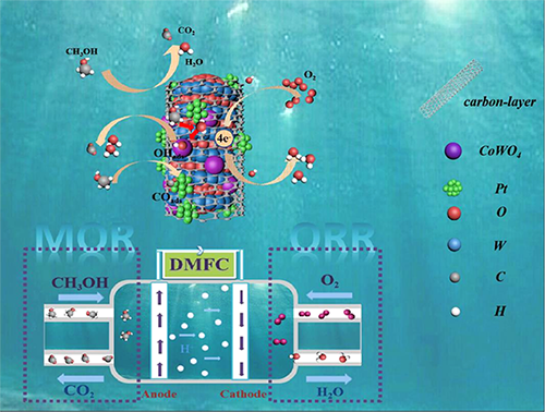 which is coated by a carbon-layer (~5 nm). Pt-CoWO