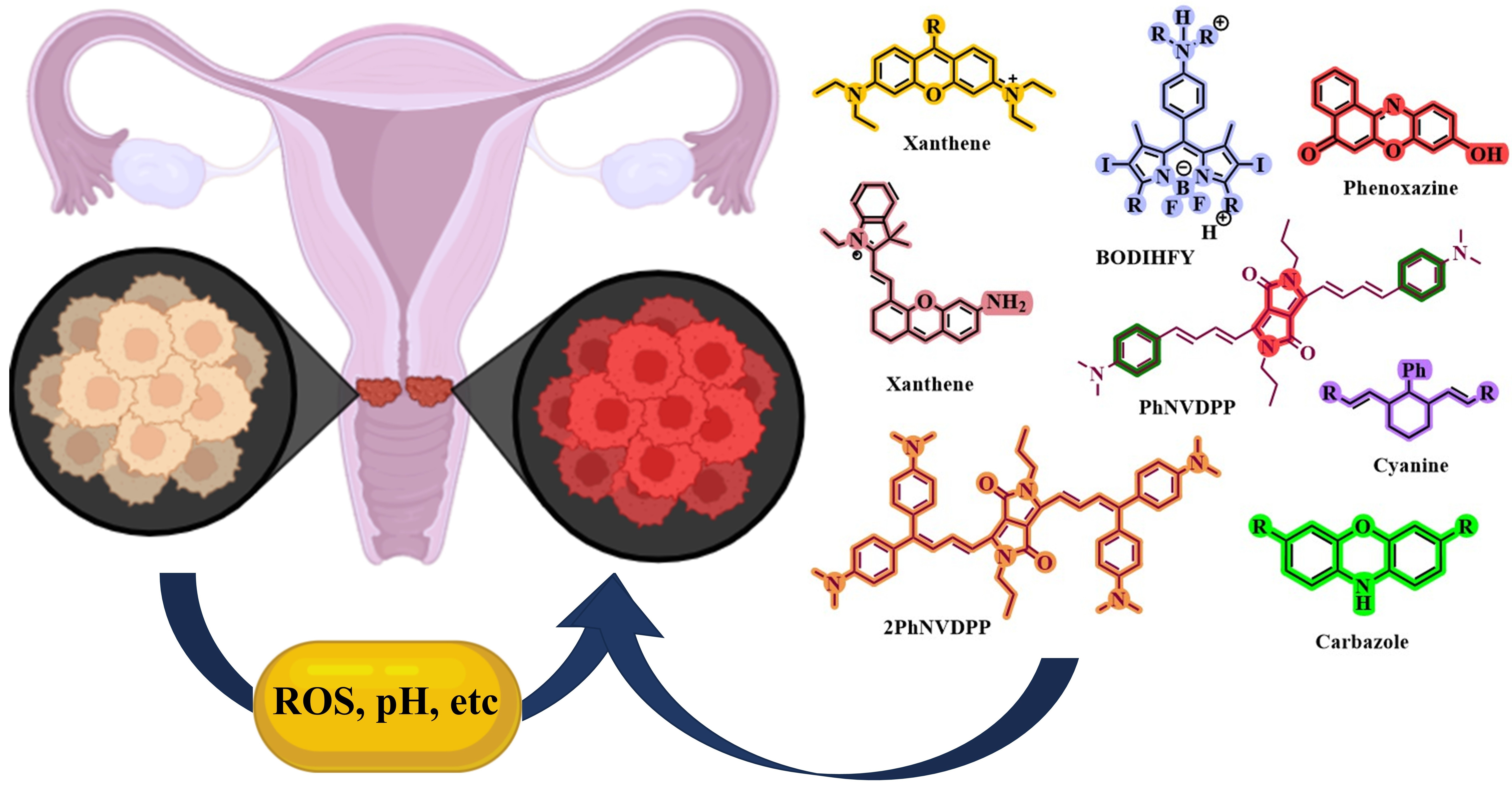 Organic near-infrared (NIR) fluorophores are being considered as next-gen tools for targeted imaging of HeLa cells and cervical cancer because they have less phototoxicity, less background autofluorescence, and better tissue penetration than traditional fluorophores. Through this review article, we have discussed how recent developments in rational molecular engineering have resulted in probes that are more attuned to particular tumor microenvironmental signals as viscosity, pH, reactive oxygen species, and enzyme overexpression. These probes are brighter, have larger Stokes shifts, and can be tuned through techniques like π-extension, donor-acceptor frameworks, heteroatom incorporation, and aggregation-induced emission algorithms. Potential platforms for image-guided therapy in cervical malignancies include BODIPY, carbazole, phenothiazine/phenoxazine, phenyl derivatives, and rhodamine/xanthene analogues. Early diagnosis, surgical guiding, and theranostic applications are just a few of the many uses for these platforms. Efforts within the scientific community to enhance clinical accuracy should focus on three key areas: (1) expanding the NIR-II window for fluorophore emission to improve tissue penetration and signal quality; (2) developing activatable probes specific to organelles; and (3) integrating these systems with cutting-edge optical imaging tools analysis. Nevertheless, there are still challenges to be solved, including issues with photostability, synthesis complexity, nonspecific interactions, water solubility, and gaps in the translation of results from preclinical models to human applications. These limitations must be overcome through systematic evaluation, scalable synthesis, and thorough safety profiling if organic NIR probes for imaging and treatment of cervical cancer can be quickly brought into clinical uses.