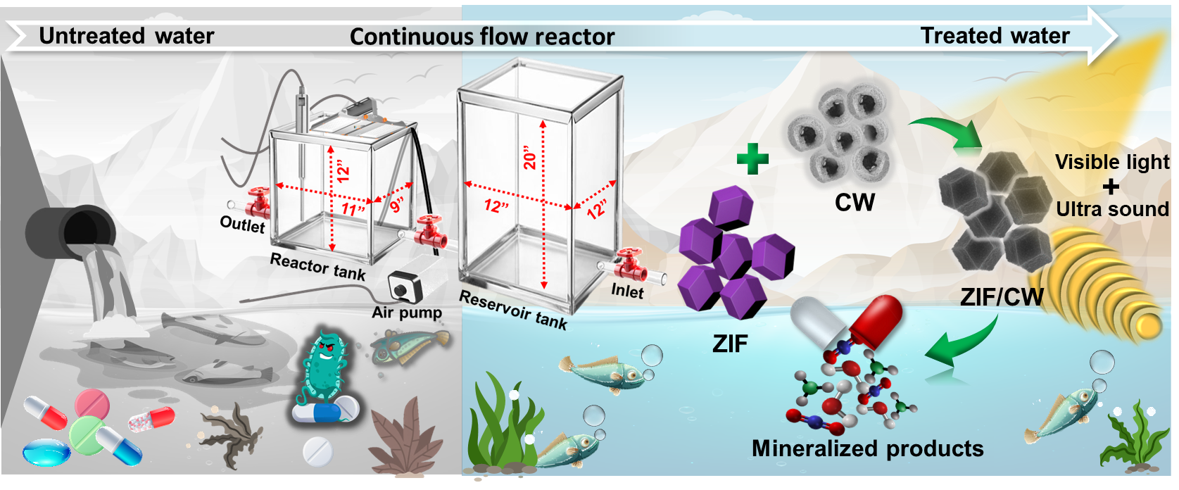 The rapid pace of industrialization has resulted in the alarming discharge of detrimental chemicals into the environment, prompting the scientific community to rethink conventional wastewater treatment technologies. Sonophotocatalysis, a synergistic green approach, harnessing the combined forces of ultrasound and visible light, has emerged as a promising frontier in environmental remediation. Leveraging the exceptional surface area, porosity, and coordination flexibility of Zeolitic Imidazole Frameworks (ZIF-67), a type of Metal-organic framework (MOF), makes it an excellent scaffold for catalyst design. Forming the core of this approach, a CoWO4-decorated ZIF-67 hybrid nanocomposite was developed and utilized as a sonophotocatalyst to degrade tetracycline (TC) under dual-energy exposure. The CoWO4/ZIF-67 catalyst achieved an unprecedented TC degradation efficiency of 98% within 75 minutes, outperforming standalone sonocatalytic and photocatalytic treatment, with excellent reusability. Mechanistic insights, supported by theoretical studies, revealed a strong interaction between the structural and physicochemical properties of the catalyst and energy-induced reactive oxygen species (ROS) generation. A large-scale continuous-flow sonophotocatalytic reactor of 20 L was fabricated to evaluate the performance of the synthesized catalyst on real wastewater samples containing interfering ions. The system achieved an 85% reduction in total organic carbon (TOC), demonstrating excellent scalability and practical applicability, offering a promising approach for treating emerging organic pollutants in an efficient and environmentally friendly manner.
