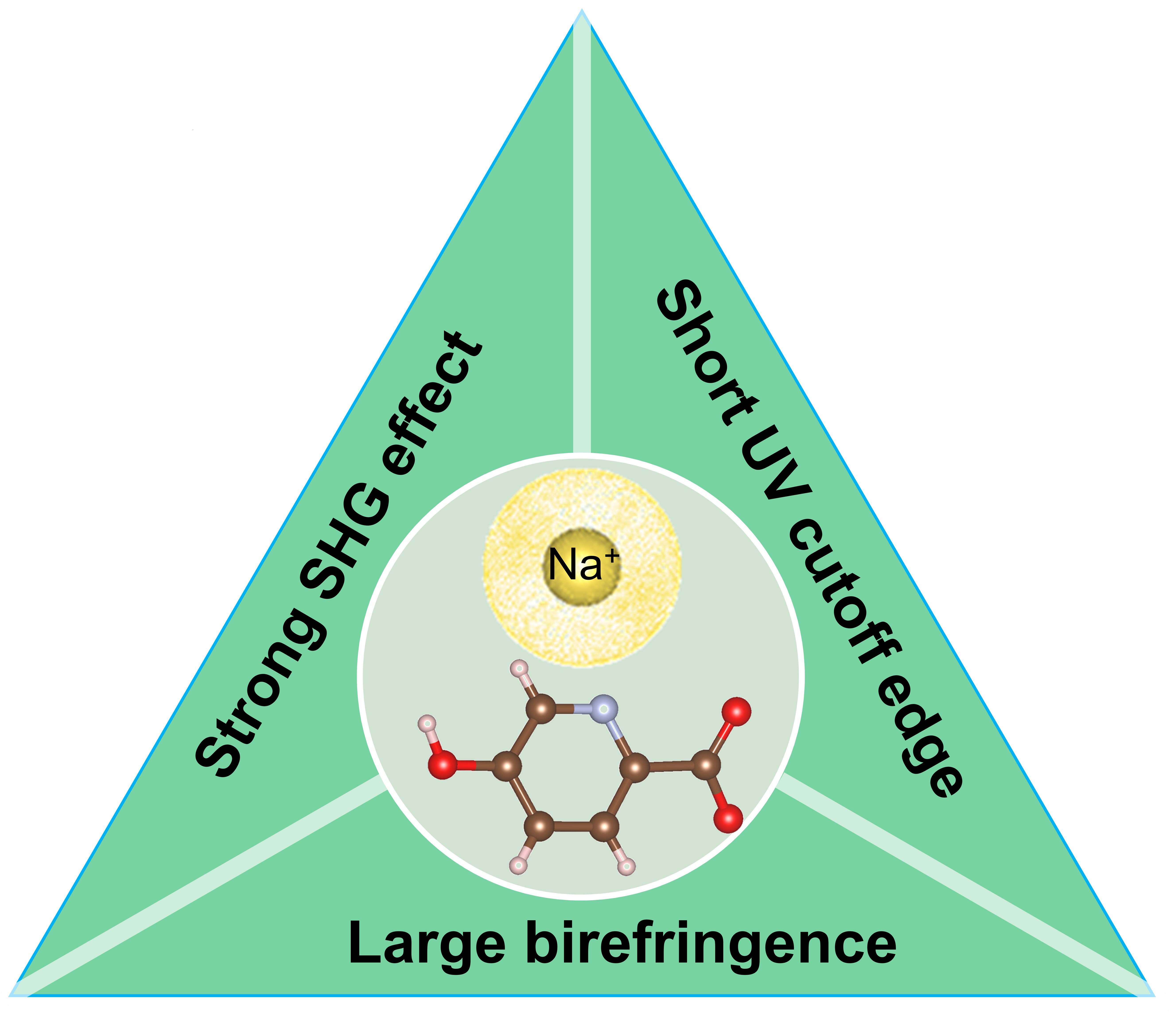 Ultraviolet (UV) nonlinear optical (NLO) crystals are essential for advancing laser-based technologies in the UV region. However, overcoming the inherent trade-off between nonlinearity and bandgap in UV NLO materials remains a fundamental challenge. Herein, we propose an innovative molecular design strategy employing 5-hydroxy-2-pyridinecarboxylic acid as a novel molecular motif, characterized by its moderate π-conjugated, multidentate coordination capability, and low toxicity. By combining this organic ligand with alkali metals, we successfully obtained a noncentrosymmetric hybrid crystal, Na2(C6H4NO3)2∙H2O. This compound achieves an exceptional combination of a strong phase-matched second-harmonic generation response (6.2 × KDP), large birefringence (0.394), and a short UV cutoff edge (282 nm), effectively mitigating typical performance limitations. This work not only provides a promising candidate for UV laser applications but also demonstrates an effective strategy for designing high-performance hybrid crystals for coherent UV light generation.