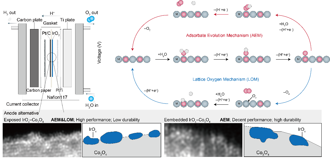 Developing efficient and durable electrocatalysts that minimize or eliminate Ir usage is essential for large-scale hydrogen production through proton exchange membrane water electrolysis. In this work, two IrOx–Co3O4 catalysts with distinct interfacial configurations were constructed to clarify the effect of structural coupling on activity and stability. The embedded IrOx–Co3O4 was prepared via a galvanic replacement–induced embedding process, while the surface-exposed IrOx–Co3O4 was obtained through photo-reduction deposition. Structural analyses confirm the formation of strong Co–O–Ir linkages in embedded IrOx–Co3O4, in contrast to discrete surface IrOx nanoparticles in the exposed sample. Electrochemical measurements show that exposed-IrOx delivers a lower overpotential of ≈ 331 mV at 10 mA cm-2 but suffers from fast Ir dissolution, whereas embedded IrOx maintains stable operation with a voltage of 1.78 V at 1 A cm-2 for over 200 h in a PEM cell. In-situ Raman and DEMS results reveal that embedded IrOx follows a dominating classical adsorbate-evolution mechanism (AEM), while exposed IrOx–Co3O4 involves a lattice-oxygen-mediated mechanism (LOM), leading to its inferior stability. This work highlights that strengthening Co–O–Ir interface effectively suppresses Ir loss and provides a general strategy for designing robust Ir-based catalysts for acidic water electrolysis.