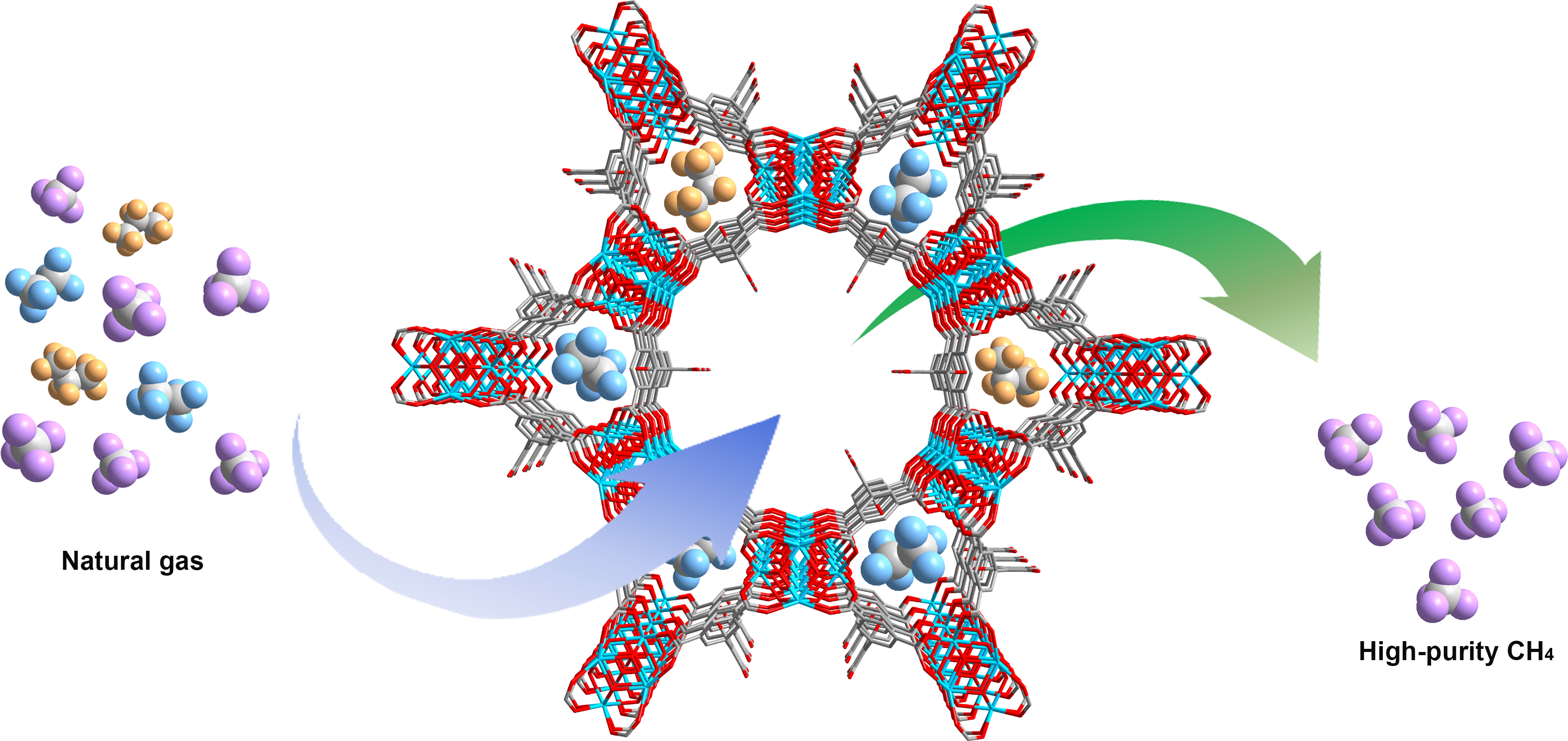 Separating natural gas to obtain high-purity CH4 is of great significance for tackling pressing energy crises and mitigating environmental issues. However, the low C3H8 and C2H6 capture efficiency of current adsorbents frequently results in inadequate CH4 purification. In this work, we have successfully constructed a dual-pore Zr-MOF (FJI-W60), in which the larger channels facilitate rapid molecular diffusion, while the smaller pores can create strong interactions with C3H8 and C2H6 molecules. These significant features collectively ensure the highly efficient adsorption of C3H8 and C2H6. Static and dynamic adsorption experiments reveal that FJI-W60 exhibits high uptake capacity and rapid adsorption kinetics for both C3H8 and C2H6. The practical breakthrough experiments validate the outstanding CH4 purification performance of FJI-W60. At 298 K, 8.6 mol kg-1 of high-purity can be obtained from the 5/10/85 C3H8/C2H6/CH4 (v/v/v) mixture, which exceeds most CH4-purification materials.