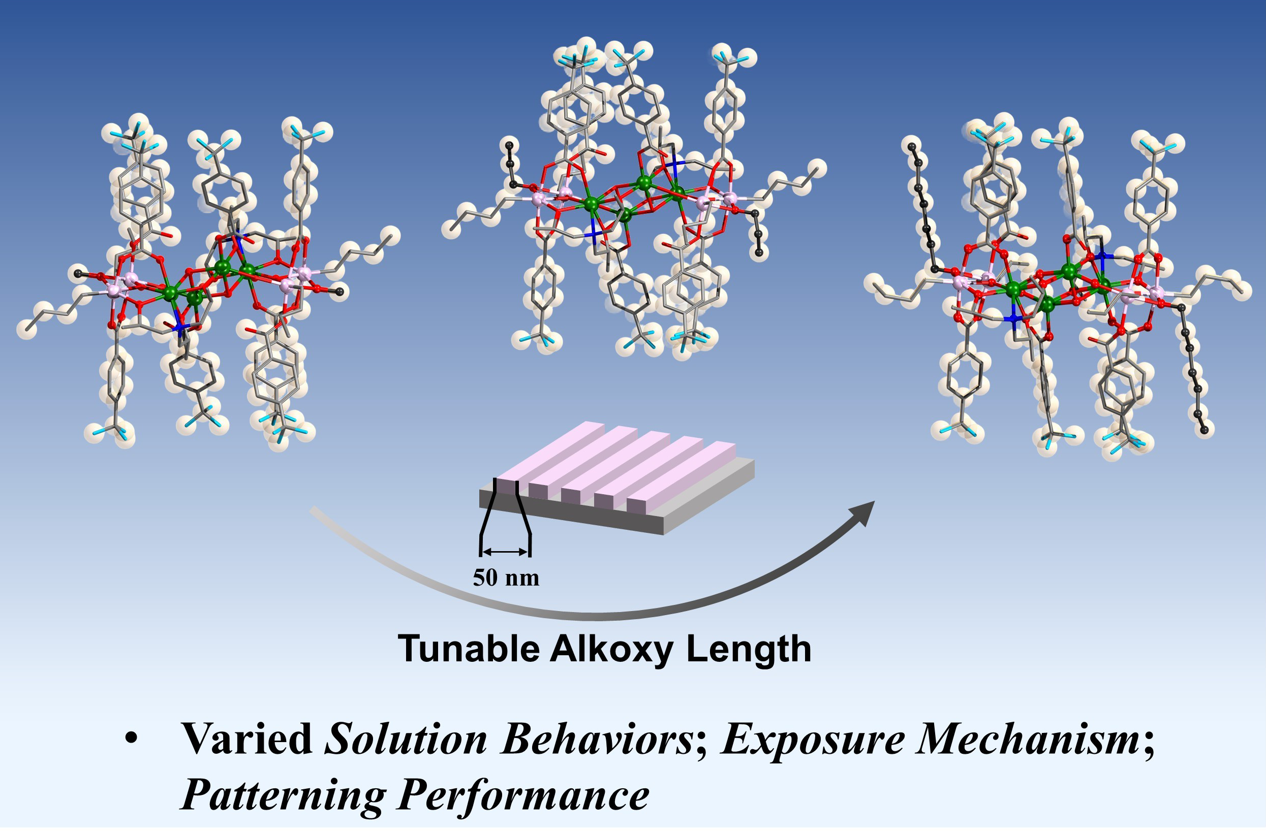 The limited solubility and solution processability of metal-oxo clusters often hinder their practical application. To address this, we employed a ligand engineering strategy to synthesize a family of In4Sn4-oxo clusters (InOC-31 to InOC-37) sharing an identical core but functionalized with alkoxy ligands of progressively increasing chain lengths (C1–C7). The influence of alkoxy chain length and conformation on solubility, solution processability, patterning mechanism, and lithographic performance is thoroughly investigated. Solubility in 4-heptanone increases monotonically from 14.7 mg/mL (C1, InOC-31) to 31.4 mg/mL (C7, InOC-37). The resulting clusters exhibit excellent stability and tunable solubility, enabling high-quality thin-film fabrication via spin-coating. Four representative clusters (InOC-31 to InOC-34) each achieved fine patterning at 50 nm linewidth, with the propoxy-functionalized InOC-33 exhibiting optimal performance, including high sensitivity and better line edge roughness. Combined experimental and theoretical analyses reveal that the exposure mechanism involves Sn–butylene/phenyl–Sn crosslinking, multipath cleavage of carboxylate ligands, and competing decomposition routes of the alkoxy ligands. Notably, we propose a novel mechanism wherein alkoxy chain length dictates the decomposition route—proceeding either via direct dissociation or through β-H elimination to form alkenes—which critically governs the observed variations in lithographic performance. This newly elucidated lithographic mechanism provides valuable insights for the design of next-generation metal-based photoresist materials.
