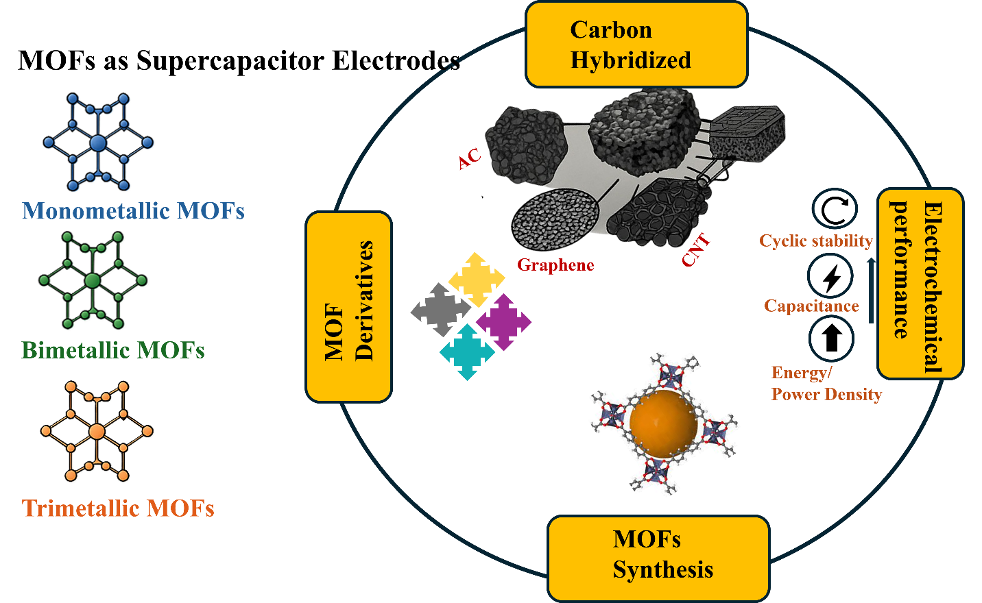 An expanding human population and technological progress demand clean and effective energy-storing systems. Within the realm of energy-storing devices, Supercapacitors have grabbed huge focus owing to their high-power density, unique cycling stability, and fast charging discharging capabilities. Electrode material has a prominent impact on the effectiveness of supercapacitors. Several types of electrode materials have been used, encompassing varied metal oxides, activated carbon, conducting polymers, and MOFs. Metal organic frameworks (MOFs) are considered emerging electrode candidates, which could be ascribed to the tunable porosity, large surface areas, and designed morphology. This review shows a detailed analysis of various mono, bi, and trimetallic MOFs along with derivatives in supercapacitor applications, their structural characteristics, and synthetic strategies. It also critically evaluates MOFs potential to boost the supercapacitor’s energy density, power density, stability, and conductivity. It also underscores their significance in the establishment of future-oriented energy storage applications.