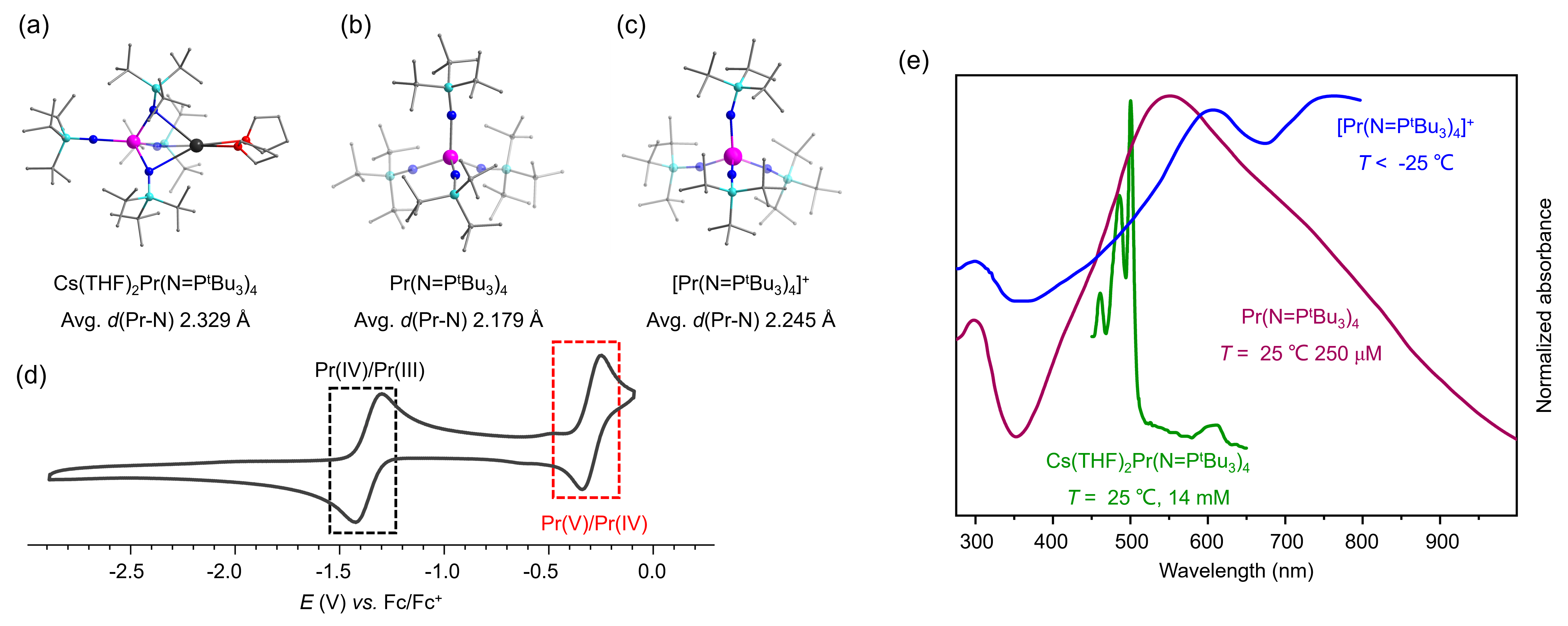 To summarize, the first isolable pentavalent lanthanide complexes were obtained by chemical oxidation of a tetravalent complex at low temperature. Their crystal structures have been determined by single-crystal X-ray diffraction studies, while the formal +5 oxidation state of the metal ion is established by the combined use of electrochemical and spectroscopic analyses. The experimental results are supported by computational studies of the electronic structures of the complexes. This work expands the landscape of the redox chemistry of the lanthanides and provides a critical framework for understanding high-valence metal bonding across the periodic table. Future efforts may be directed toward 1) making Pr(V) complexes with other types of ligands to tune the electronic structures; 2) assessing their catalytic potentials; 3) exploring analogous high-valence-state chemistry for other early lanthanide elements (e.g. Nd, Sm); and 4) developing advanced theoretical models for accurate description of multiconfigurational f-element systems.