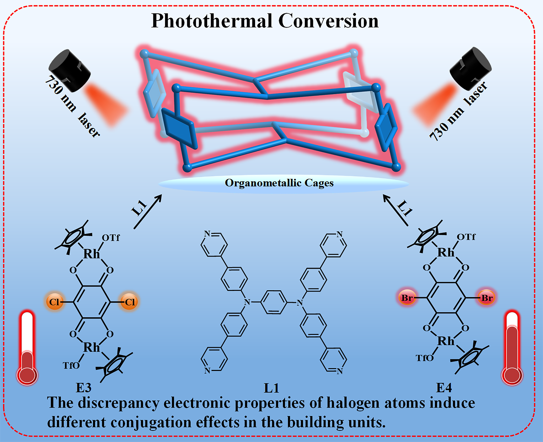 The structural synthesis and property exploration of organometallic cages has always attracted widespread attention from chemists. Nevertheless, the achievement on photothermal property enhancement and their application in solar-driven water evaporation via structural modulation remains scarce. Here, four organometallic cages 1, 2, 3 and 4 with different functional sites are synthesized via reasonably selecting different building units E1, E2, E3 and E4 based on a tetradentate pyridyl ligand L1. These complexes are characterized by single-crystal X-ray diffraction analysis, nuclear magnetic resonance (NMR) spectroscopy and ESI-TOF-MS analysis. Notably, they exhibit different near-infrared (NIR) photothermal conversion properties due to variations in their size, conjugated area, electron-withdrawing characteristic of halogen atoms in building units. Compound 4 shows the optimal photothermal performance among the series, with notably enhanced near-infrared absorption and the highest photothermal conversion efficiency. The radical effect of the building unit plays an important role in photothermal conversion ability as evidenced by the significant EPR signal changes. Therefore, compound 4 is used to construct new membrane 1', achieving a solar power-induced water steam generation rate of 1.92 kg·m-2·h-1, demonstrating its suitability for the collection of fresh water through desalination and wastewater treatment.. This research provides a new strategy for synthesizing and optimizing photothermal conversion property of half sandwich organometallic cages.