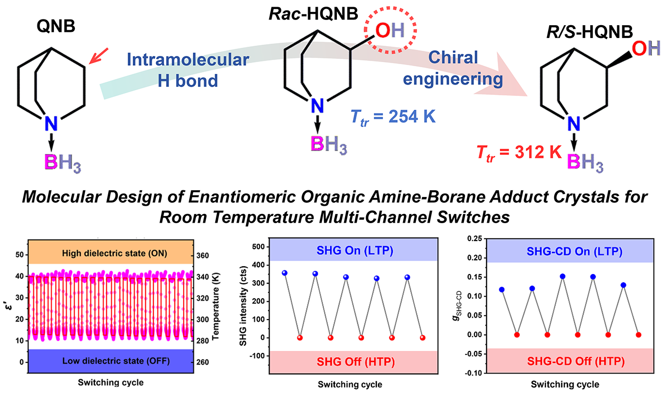 Stimuli-responsive materials offer significant potential for high-security encryption, smart sensors, and optoelectronic switching due to their reversible state transitions triggered by external stimuli (temperature, light, or electric fields). Combining quasi-spherical molecular design with chiral engineering, we designed enantiomeric organic amine-borane adduct crystals exhibiting multi-channel switching behavior at room temperature. The strategic introduction of intramolecular hydrogen bonding and chirality in engineered R/S-HQNB crystals successfully enables room-temperature structural phase transitions. This transition is coupled with pronounced on-off switching in dielectric, SHG, and SHG-CD responses, demonstrating practical application potential through ambient-temperature operation, which is rarely documented in pure small molecule organic crystals. This advance establishes a pathway for functional organic materials design and enables chiral optical applications with integrated stimuli-responsive capabilities.