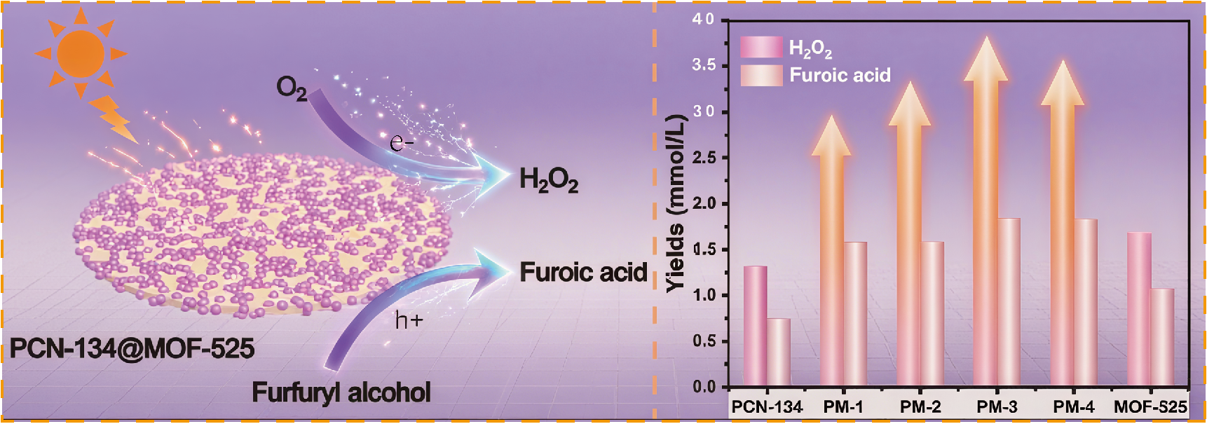 By integrating photocatalytic H2O2 production with furfuryl alcohol (FAL) oxidation, this coupled process establishes an atom-economical pathway for sustainable chemical synthesis, simultaneously achieving energy storage and biomass valorization. This study introduces a meticulously engineered MOF@MOF hierarchical photocatalytic architecture, specifically the PCN-134@MOF-525 (PM-X series) composite, designed for synergistic catalysis of these processes. By strategically integrating two distinct MOF materials, we circumvent the limitations of single-component systems, such as facile charge carrier recombination, and establish a redox dual-active site catalytic system. This rational design transcends simple additivity, yielding emergent catalytic behaviors driven by precise control over interfacial electric fields and dynamic structural modulation. The resultant hierarchical organization enhances light harvesting, promotes efficient charge separation, and accelerates charge transfer kinetics. Mechanistic insights, derived from photoelectrochemical, spectroscopic, and in-situ IR analyses, reveal a synergistic interplay that suppresses electron-hole recombination and spatially segregates redox processes. PM-3 demonstrates a significant enhancement in catalytic efficiency (highest value reported) , exhibiting a 4.5-fold increase in both H2O2 production and FAL oxidation rates compared to the individual MOF components, achieving near-quantitative FAL conversion and exceptional selectivity. This work provides a potent design blueprint, emphasizing interfacial engineering and structural synergy for unprecedented efficiency and selectivity in sustainable chemical transformations.