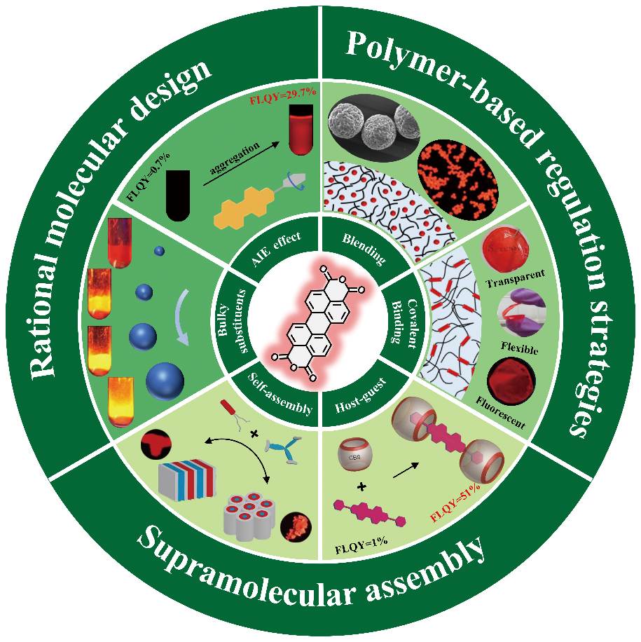 Perylene diimide (PDI) derivatives have emerged as a class of important organic fluorescent materials owing to their high extinction coefficient, excellent thermal and photostability, and versatile structural tunability. However, due to its intrinsic rigid planar structure, π-π stacking is easy to occur, resulting in aggregation-caused quenching (ACQ). In recent years, extensive efforts have been devoted to overcome this challenge and enhance the fluorescence performance of PDIs. This review systematically summarizes representative strategies from three major perspectives: (ⅰ) Rational molecular design, including the introduction of bulky aromatic substituents, dendritic or POSS units to provide steric hindrance, as well as the activation of aggregation-induced emission (AIE) (ⅱ) Polymer-based regulation strategies, including physical blending with polymer hosts and covalent integration into polymer backbones, which provide spatial isolation and structural robustness; and (ⅲ) Supramolecular assembly, where host-guest inclusion and self-assembly pathways precisely tune intermolecular packing and excitonic coupling. These strategies have enabled significant improvements in fluorescence quantum yield across solution, aggregate, and solid states. Furthermore, highly emissive PDI derivatives have demonstrated broad applicability in biomedicine, sensing and anti-counterfeiting, and optoelectronic devices such as OLEDs. This review highlights the fundamental design principles, performance optimization strategies, and emerging application frontiers of PDI-based luminescent materials, providing guidance for their further development toward multifunctional and sustainable optoelectronic technologies.