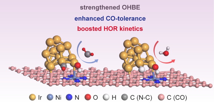 Addressing the CO-sensitive and catalytic efficiency issues of noble metal-based electrocatalysts towards alkaline hydrogen oxidation reaction (HOR) are indispensable for the practical commercialization of advanced anion exchange membrane fuel cells (AEMFCs). Here, Ni-N-C supported Ir catalysts denoted as Ir/Ni-N-C have been constructed and demonstrated greatly improved resistance towards CO impurities compared to conventional N-C or pure C anchored Ir nanoparticles after long-term CO poisoning. Besides, Ir/Ni-N-C possesses superior specific and mass activity of 0.557 mA cm-2 and 1.15 mA mgPGM-1, which is approximately 2-times higher than that of Ir/C and even outperforms the state-of-the-art commercial Pt/C catalysts. Combining in-situ surface-enhanced infrared absorption spectroscopy and density functional calculation, the band structure modulation and coordination effect of Ni-N-C supports lead to strengthened hydroxyl binding energy, promoted CO oxidative desorption under working potential, and lowered activation barrier of the rate-determining process of alkaline HOR. This work sheds light on the importance of metal-N-C substrates for solving the CO-tolerance and intrinsic activity challenges, provides new insights for noble-metal based catalysts designing.