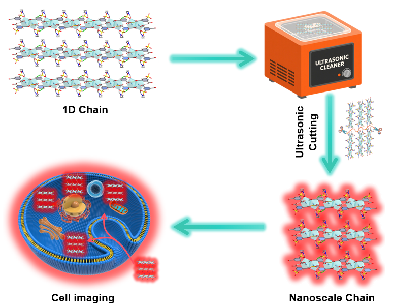 In this work, an ultrasonic tailoring strategy was used to obtain nanosized one-dimensional chain-like lanthanide metal-organic frameworks (Ln-MOFs) with excellent photophysical properties for the first time, and high-resolution bio-optical imaging applications were achieved. As the ambient temperature gradually increases, the chain-like Ln-MOFs do not show obvious thermal quenching of luminescence. It is worth noting that when the ambient temperature exceeds 300 K, the departure of the terminal-coordinated H2O molecules within the Ln-MOFs structure induces significant thermally enhanced luminescence. Furthermore, by regulating the energy transfer pathways of bimetallic-doped TbxEu(1-x)-MOFs, a series of luminescence changes from yellow-green to red were achieved. Based on the multiple excitation, thermally enhanced luminescence, and multicolor luminescence properties of Ln-MOFs, a complex anti-counterfeiting system was constructed. More noteworthy is that the Ln-MOFs nanochains obtained using the ultrasonic cutting strategy have high-resolution optical imaging effects on HeLa, MCF-7, MDA-MB-231 cells and living zebrafish, and can specifically label the lysosomes of living cells. This work opens up new horizons for the application of multidimensional lanthanide complex emitters in high-resolution bio-optical imaging and opens a new blueprint for constructing lanthanide complex emitters with "all-in-one" functions.