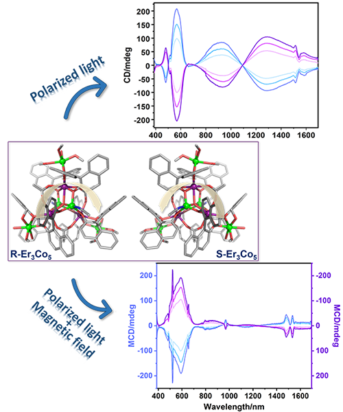 Heterometallic 3d-4f clusters represent a promising class of multifunctional molecular materials, driven by the synergistic interactions between d- and f-electrons. Incorporating chirality into these systems further expands their potential applications, particularly in chiroptical and magneto-optical technologies. Herein, we report the successful synthesis of chiral [Ln3Co5] (Ln = Er and Y) clusters using binaphthol-based ligands. Single-crystal X-ray diffraction reveals the coexistence of two distinct Co2+ coordination geometries: six-coordinate octahedral and five-coordinate trigonal bipyramidal. Spectroscopic analyses demonstrate geometry-dependent chiroptical behavior: pentacoordinate Co2+ ions predominantly contribute to the circular dichroism (CD) features, while both geometries exhibit distinguishable signals in the magnetic circular dichroism (MCD) spectra. Notably, a pronounced magnetic dipole transition (4I15/2 → 4I13/2) from Er3+ centers is observed in the near-infrared MCD region, displaying a high g-factor of 0.0078 T-1. This work highlights the configuration- and ligand field-dependent chiroptical responses in 3d-4f systems, providing new insights for the rational design of advanced magneto-optical devices.