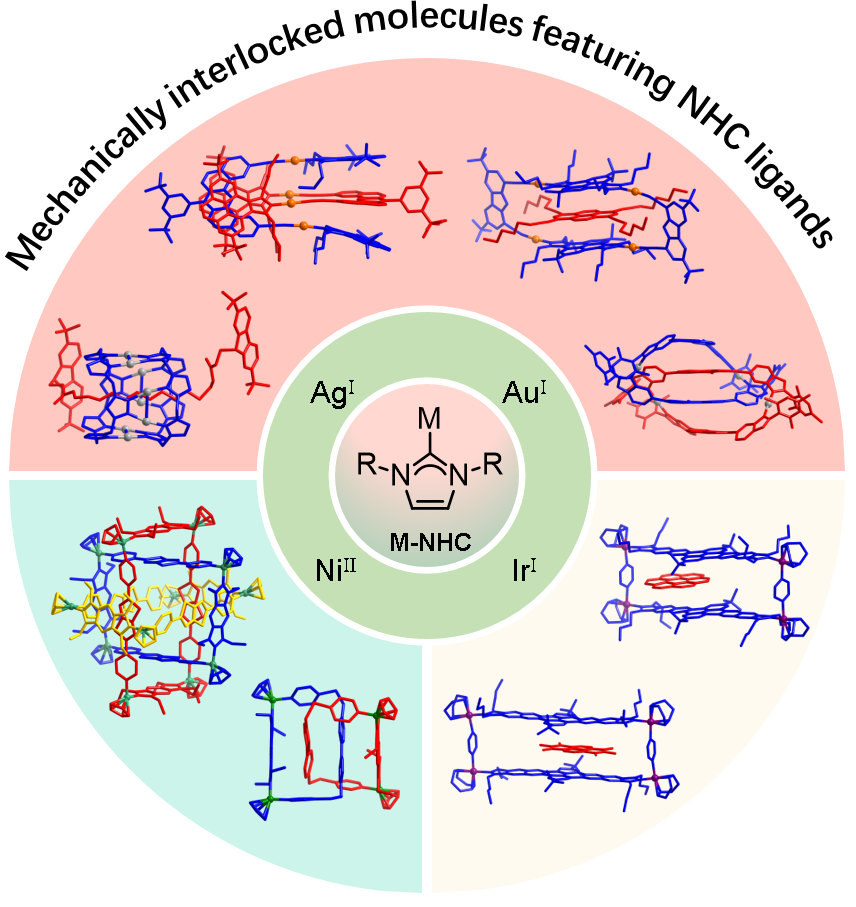 Coordination-directed synthesis has emerged as an effective and versatile approach for constructing mechanically interlocked molecules (MIMs). This field has long been dominated by Werner-type complexes featuring oxygen and/or nitrogen donors, whereas assemblies incorporating N-heterocyclic carbene (NHC) donors remain underexplored. This Review provides a comprehensive overview of the rapidly developing field of MIMs constructed from poly-NHC-based building blocks. By highlighting representative recent examples, this Review focuses on the pivotal role of NHC ligands and the robustness of the metal–CNHC bond in the construction of metallosupramolecular interlocked structures. In addition, this Review summarizes contemporary strategies for achieving efficient assembly, analyzes defining structural attributes of the resulting architectures, and outlines current challenges and emerging opportunities for future developments in NHC-based MIMs.