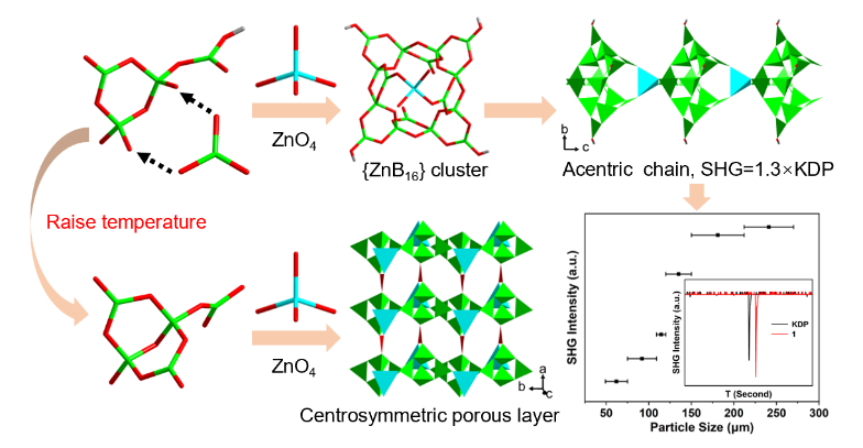 Four zinc borates, MNa9ZnB16O28(OH)4 (M = K, Rb, Cs; 1−3) and Na3ZnB5O10 (4) have been made under solvothermal conditions. Compounds 1−3 are isostructural and contain an unprecedented [B16O28(OH)4]12− cluster constructed from eight B3O3 rings sharing BO4 tetrahedra. The clusters further link with ZnO4 tetrahedra to form one-dimensional (1-D) chains, which further assemble into a 3-D supramolecular framework through hydrogen bonds. 4 was made by raising the reaction temperature of 1 and features a porous-layer structure composed of [B4O9]6−clusters, BO3 units and ZnO4 tetrahedra. All compounds exhibit short deep ultraviolet (DUV) cutoff edges below 190 nm. Notably, 1−3 crystallize in the acentric space group I−4 and display second harmonic generation (SHG) responses of approximately 1.26, 1.30 and 1.32 times that of KH2PO4 (KDP), respectively, highlighting their potential as DUV nonlinear optical materials.