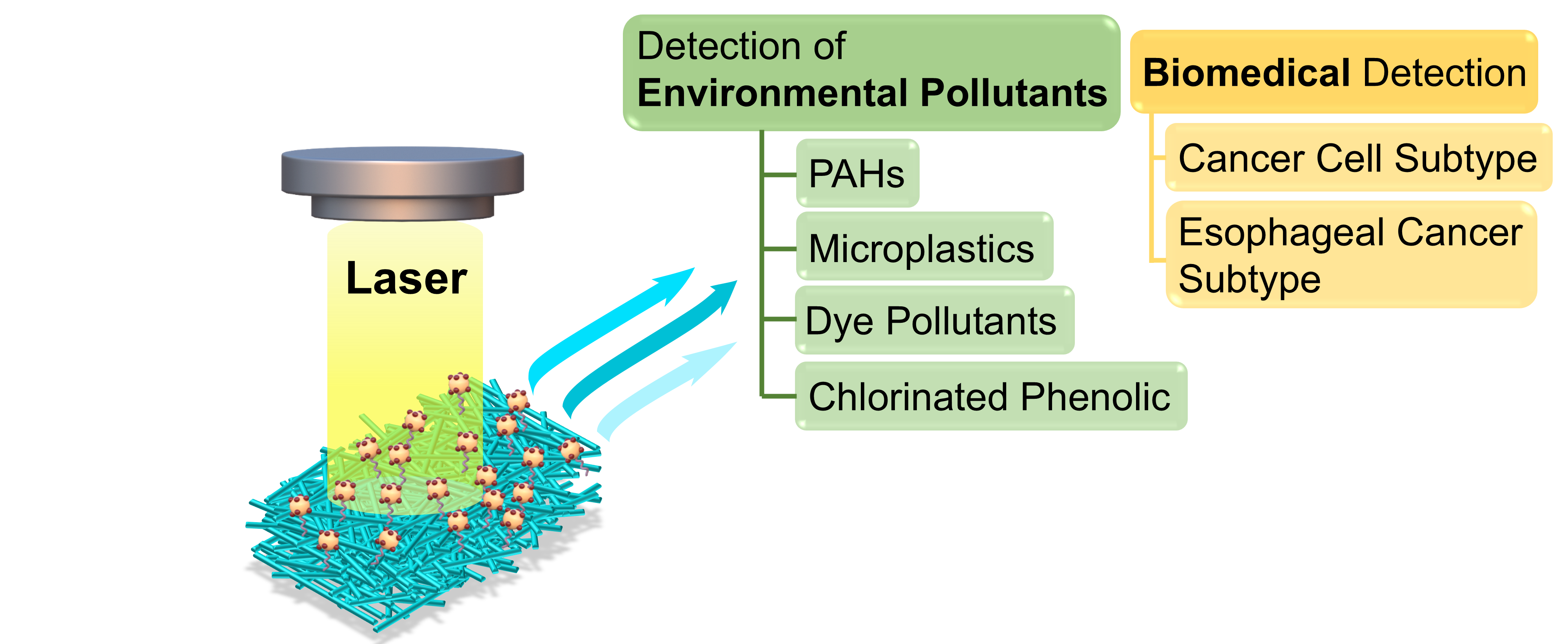 Although surface-enhanced Raman scattering (SERS) technology has been widely applied in fields such as environmental pollutant monitoring and early cancer diagnosis, the design of universal substrates to enable high-sensitivity detection across multiple scenarios remains a pressing problem to be solved. In this study, an innovative defect engineering strategy was employed to successfully develop a SERS substrate based on molybdenum oxide sub-nanowires (MoO3-x Sub-NWs) with a high oxygen vacancy (Vo) concentration. This substrate uniquely combines the gradient defect states induced by Vo and the quantum confinement effect generated by the one-dimensional sub-nanostructure, thereby achieving the synergy of chemical enhancement and electromagnetic enhancement. Experimental results demonstrate that the substrate exhibits an enhancement factor as high as 7.8×107 for rhodamine 6G, achieves a LOD of 10-11 M for dyes such as methyl orange, and enables effective detection of various environmental pollutants including polychlorinated phenols, polycyclic aromatic hydrocarbons, and polystyrene microspheres. In terms of biomedical applications, based on the PCA-LDA model, the method achieves a three-category classification accuracy of 92.22% for hepatocellular carcinoma cells (HepG2), esophageal cancer cells (TE-1), and white blood cells (WBC), a discrimination accuracy of 90% for esophageal cancer subtypes (TE-1 and KYSE), and an ROC curve AUC value of 0.97. This study provides a new paradigm for the development of high-performance universal SERS substrates and possesses significant application value in the fields of environmental monitoring and non-invasive tumor diagnosis.