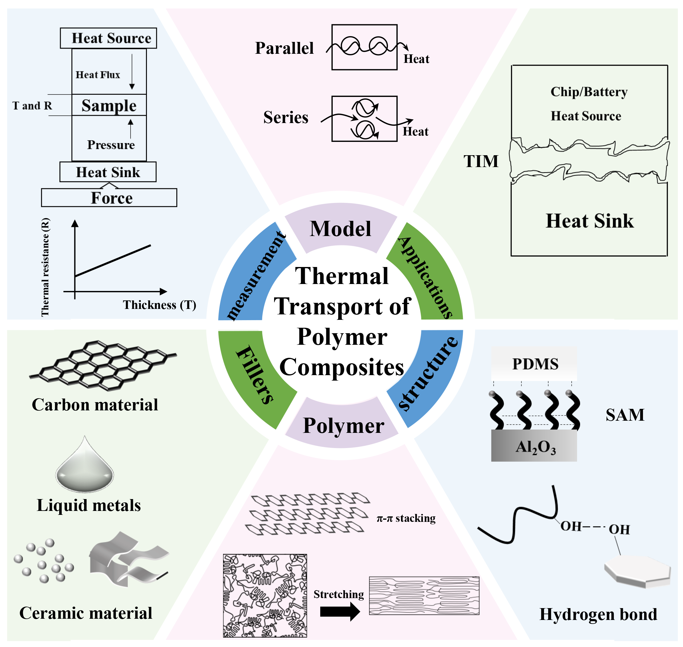 Polymers are indispensable in modern technologies because of their lightweight nature, processability, and mechanical compliance, yet their inherently low thermal conductivity limits thermal management in applications ranging from flexible electronics and energy devices to thermal interfaces. Recent progress shows that polymer thermal transport is highly designable when viewed through a hierarchical structure–property framework that spans molecular order, mesoscale morphology, and composite architectures. This review summarizes advances in thermally conductive polymers and polymer-based composites by connecting multiscale modelling, reliable metrology, and microstructure engineering. We first discuss theoretical and computational approaches that capture phonon-dominated transport in disordered chains and quantify interfacial thermal resistance at polymer–filler interphases. We then compare key measurement techniques and highlight how test configuration, pressure, anisotropy, and sample preparation affect the extracted thermal conductivity and thermal resistance metrics. We further analyze material strategies at three levels: (i) molecular design and chain alignment to increase intrinsic polymer thermal transport, (ii) filler selection and interphase engineering to reduce vibrational mismatch and interfacial resistance, and (iii) architected networks, orientation, and hierarchical pathways to enable efficient, scalable heat conduction. Finally, we outline emerging opportunities and remaining challenges in establishing transferable design rules, standardized metrology, and manufacturable routes toward high-performance, reliable thermal management polymers and composites.