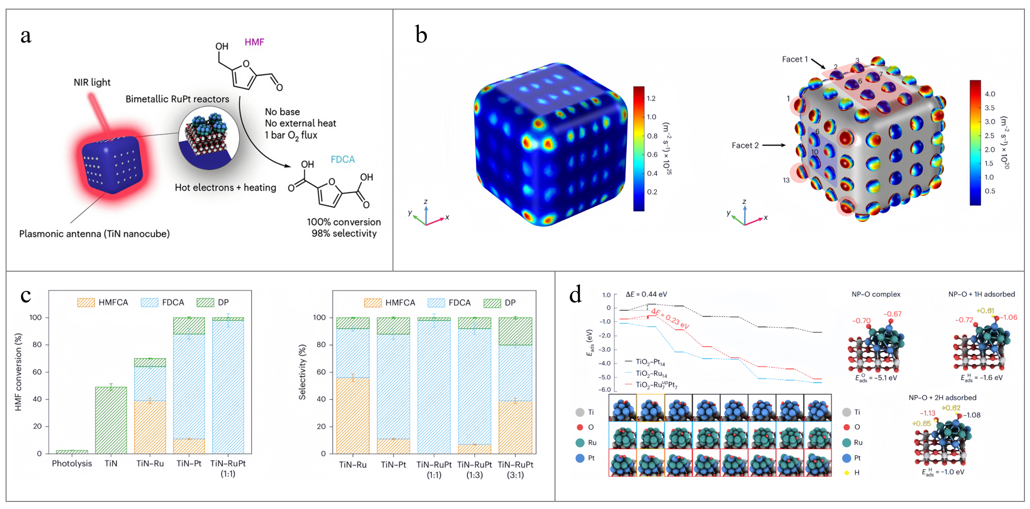Despite its high performance, practical implementation of the TiN-RuPt system faces challenges regarding the high cost of noble metals and the potential for particle sintering during long-term operation[8,9]. Future directions should explore non-metallic plasmonic antennas, such as alternative transition metal nitrides (ZrN, HfN) or carbides, to reduce capital costs and improve durability[10]. This work exemplifies how rational integration of plasmonic light‑harvesting units with tailored bimetallic active sites can drive multi‑step selective oxidations under mild, base‑free conditions. It provides a compelling blueprint for the design of solar‑driven catalytic systems for sustainable chemical synthesis and biomass valorization.