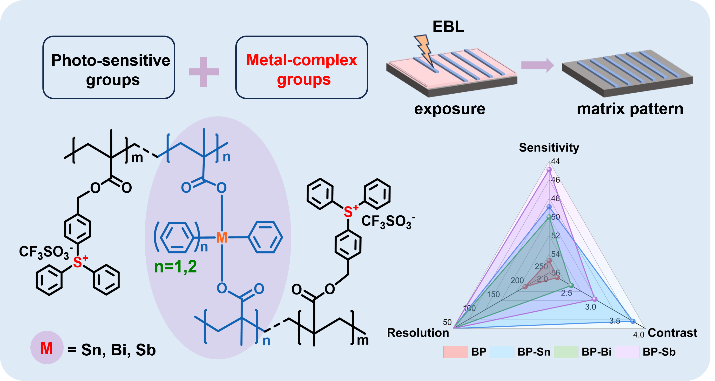 The continued scaling of extreme ultraviolet (EUV) lithography demands photoresists whose key parameters—resolution, sensitivity, and contrast—can be independently tailored to meet the specific requirements of advanced nanofabrication. Herein, we introduce a series of non-chemically amplified negative-tone photoresists based on metal-incorporated polymers, denoted as BP-M (M = Sn, Sb, Bi). The resists are constructed by covalently embedding heavy-metal complexes into a sulfonium-functionalized polymer backbone. Even at low metal loadings, the high EUV absorption and distinct photoreactivity of the metal centers enable efficient patterning without chemical amplification. Despite comparable EUV absorption coefficients, each metal imparts a unique lithographic signature: BP-Sb exhibits the highest sensitivity, BP-Bi achieves the finest resolution, and BP-Sn delivers the sharpest contrast. Lithographic performance can thus be predictably modulated through simple metal substitution. Mechanistic studies uncover a dual-action pathway wherein cleavage of metal–carbon bonds generates cross-linking radicals, while decomposition of sulfonium moieties induces polarity reversal—synergistically driving a pronounced solubility switch. This "complex–polymer synergistic design" establishes a rational platform for resist engineering, positioning antimony and bismuth as sustainable alternatives to conventional tin-based systems.