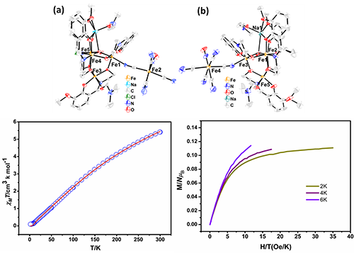 complexes {NaFe4(μ4-O)(L)4(μ2-Cl)[Fe(CN)5NO](H2O)(DMF)2} (1) and {NaFe4(μ4-O)(L)4(μ2-OEt)[Fe(CN)5NO](H2O)(DMF)2} (2) have been prepared using the tetradentate