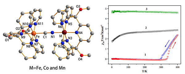 1 exhibits spin crossover (SCO) behavior over 300 K and a hysteresis of 36 K in both cooling and heating modes.