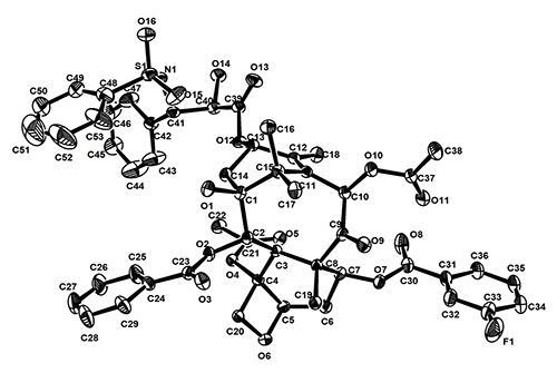 of compound 9b was determined by single-crystal X-ray diffraction. Compound 9b crystallizes in monoclinic system, space group P21 with a = 12.395(4), b = 15.215(5), c = 14.905(5) Å, β =