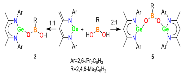 Organoboryl germanium(II) oxides were synthesized from the 1,4-addition reaction of L′Ge (L′ = HC[C(CH2)N(Ar)]C(Me)N(Ar), Ar = 2,6-iPr2C6H3) with selected monosubstituted arylboronic acids RB(OH)2 (R = 2,6-Me2C6H3, 2,4,6-Me3C6H2, 1-Naph) at the molar ratios of 1:1 and 2:1. The mononuclear products RB(OH)OGeL (L = CH[C(Me)N(Ar)]2, Ar = 2,6-iPr2C6H3;R = 2,6-Me2C6H3 (1),2,4,6-Me3C6H2 (2), 1-Naph (3)) containing the Ge–O–B core were obtained smoothly through the 1:1 reaction. However, the reaction of L′Ge with 2,6-Me2C6H3B(OH)2 in a 2:1 ratio gave only the mononuclear product (1) instead of the expected binuclear one. What’s more, a new borate compound [(2,6-Me2C6H3)4B5O6]-[H:C]+ (4) (:C = C[N(iPr)C(Me)]2) was concomitantly formed when the in situ prepared L′Ge was used as the precursor. In contrast, the use of 2,4,6-Me3C6H2B(OH)2 or 1-NaphB(OH)2 as the organoboryl source in the similar reaction led to the formation and isolation of the binuclear products RB(OGeL)2 (R = 2,4,6-Me3C6H2 (5), 1-Naph (6)) containing the Ge–O–B–O–Ge core in a straight way. Compounds 1~6 were determined by single-crystal X-ray diffraction analysis.