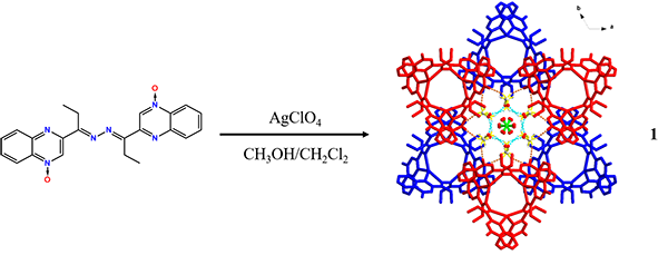 diffraction. 1 is of trigonal system space group P-31c with a = 16.320(2), b = 16.320(2), c = 20.108(6) Å, T = 173(2) K, V = 4638.2(16) Å3, Dc= 1.645 g/cm3, Mr = 2297.33, Z = 2, F(000) = 2334, μ = 0.970 mm–1, Goodness-of-fit = 1.109, the final R = 0.0776, wR = 0.1813, R indices (all data) = 0.1196, wR = 0.2011. The compound exhibits a triple-helical [Ag3L3]3+ crown-like