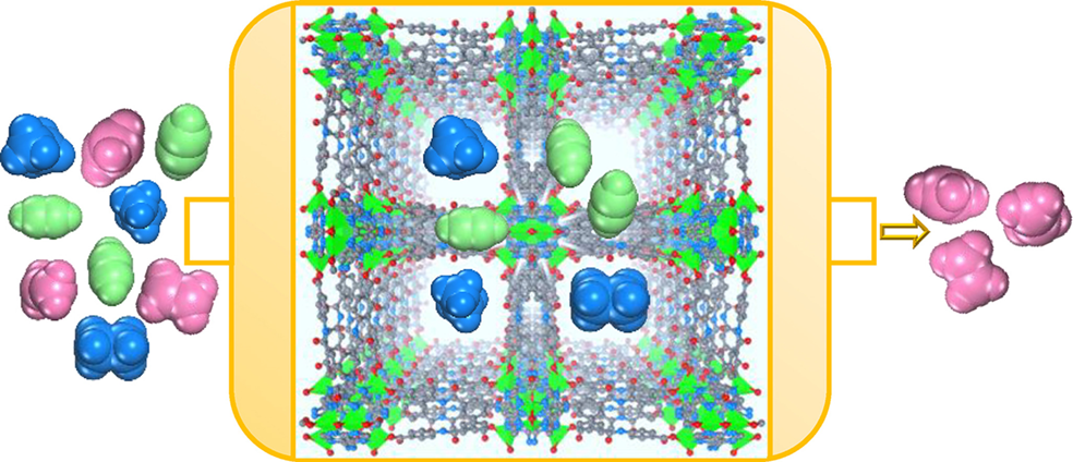 In conclusion, an amide-containing adenine-mediated zinc-based rod MOF of 1 was successfully constructed by virtue of solvothermal reaction and mixed-linker approach. SCXRD discloses that 1 features no open meal sites and exhibits 1D microporous channels replete with uncoordinated carboxylate oxygen atoms and amide groups, resulting in not only C2H2 but also C2H6 selective property. Therefore, the isolated single material of 1 is capable of separating C2H4 from a ternary mixture of C2H2/C2H4/C2H6 in one step, which was ultimately confirmed by dynamic breakthrough experiments. This work provides an impressive multifunctional MOF material toward the challenging one-step ethylene purification application.