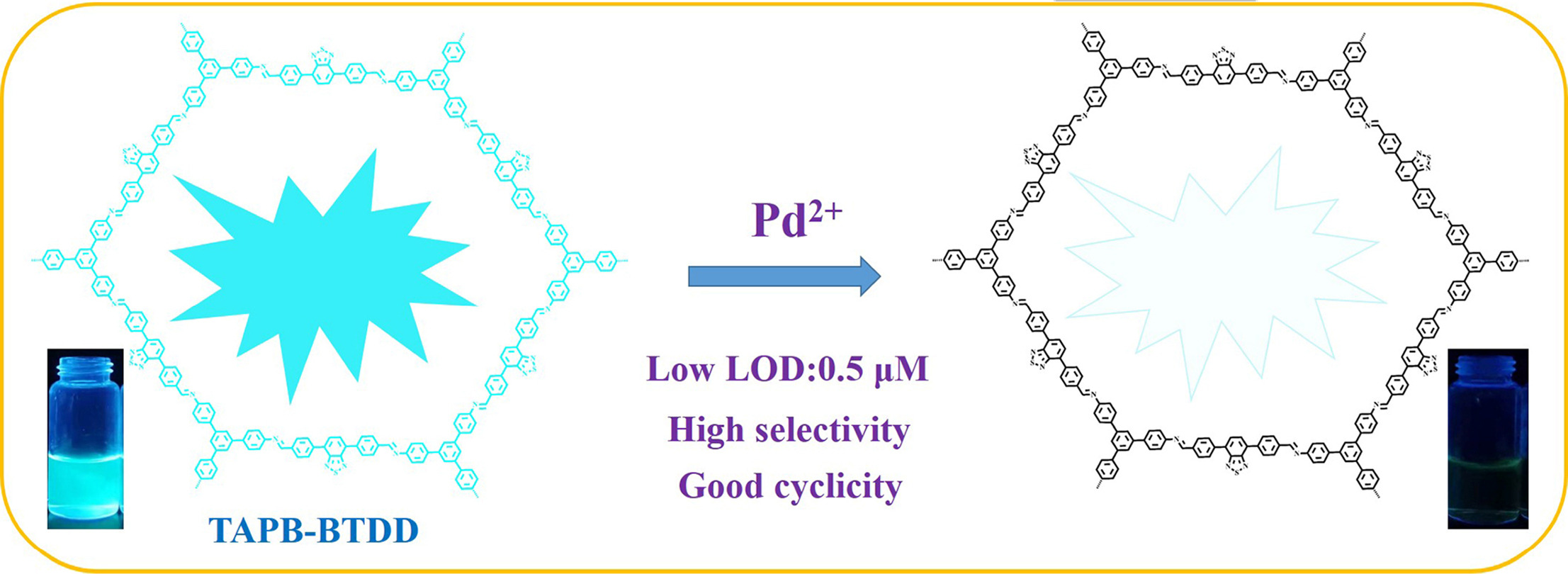In conclusion, we have developed a highly sensitive luminescent porous organic polymer probe TAPB-BTDD for ultrasensitive detection of Pd2+ in aqueous solution. The results manifested that TAPB-BTDD is a typical turn off sensor and possesses high sensitivity and specificity for Pd2+. A linear curve was achieved when measured in the range of 100–900 μM (F0/F = 0.7585 + 0.0075 [Pd2+], correlation coefficient R2 = 0.9912). The LOD was determined to be 0.54 μM for Pd2+ in methanol/H2O solution, and the other ions showed no interference effect. In addition, TAPB-BTDD showed basically unchanged emission intensities and rapid response to Pd2+ after eight recycling tests, suggesting that the POP has high stable recycle repeatability. More importantly, this work highlights that imine-based porous organic polymer is an ideal candidate for fluorescent probe for ultrasensitive detection of heavy metal ions.