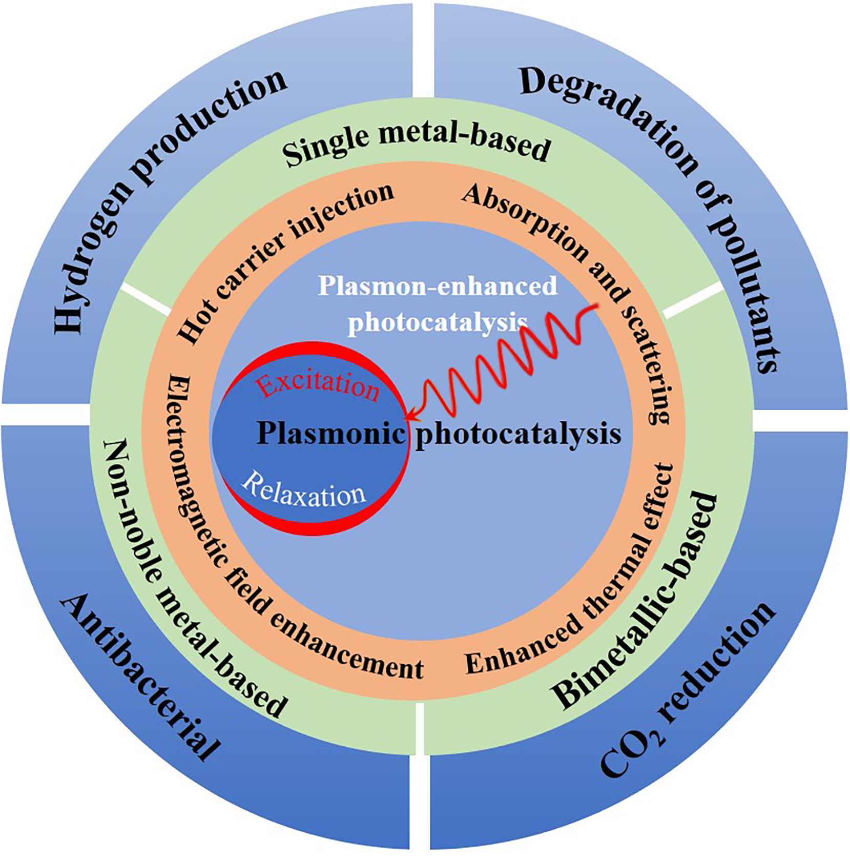 The process of photocatalysis, regarded as a promising approach for tackling the energy crisis and environmental pollution issues, is crucial for turning solar light into chemical resources. However, the solar-chemical conversion efficiency of typical semiconductor catalysts is still too low, so it is vital to figure out how to boost photocatalytic performance of semiconductors. Under visible light illumination, the local surface plasmon resonance (LSPR) induced by coinage metal would enhance the local electric field and improve photocatalytic performance of semiconductors, especially in the visible range. Therefore, its attachment to semiconductors has been regarded as an efficient strategy to improve photocatalytic performance. This paper reviews the latest research progress of plasmonic photocatalysis from theory to application. Starting from the excitation and relaxation of plasmons, four main mechanisms of plasmon-enhanced semiconductor photocatalysis are introduced, including enhanced light absorption and scattering, local electromagnetic field enhancement, improved hot carriers (HCs) injection and enhanced thermal effect. Secondly, the current mainstream plasmonic photocatalysts, such as monometallic, bimetallic and non-noble metal-based plasmonic catalysts, are reviewed. Finally, the applications of plasmonic photocatalysts in H2 production, CO2 reduction, and antibacterial are further summarized.