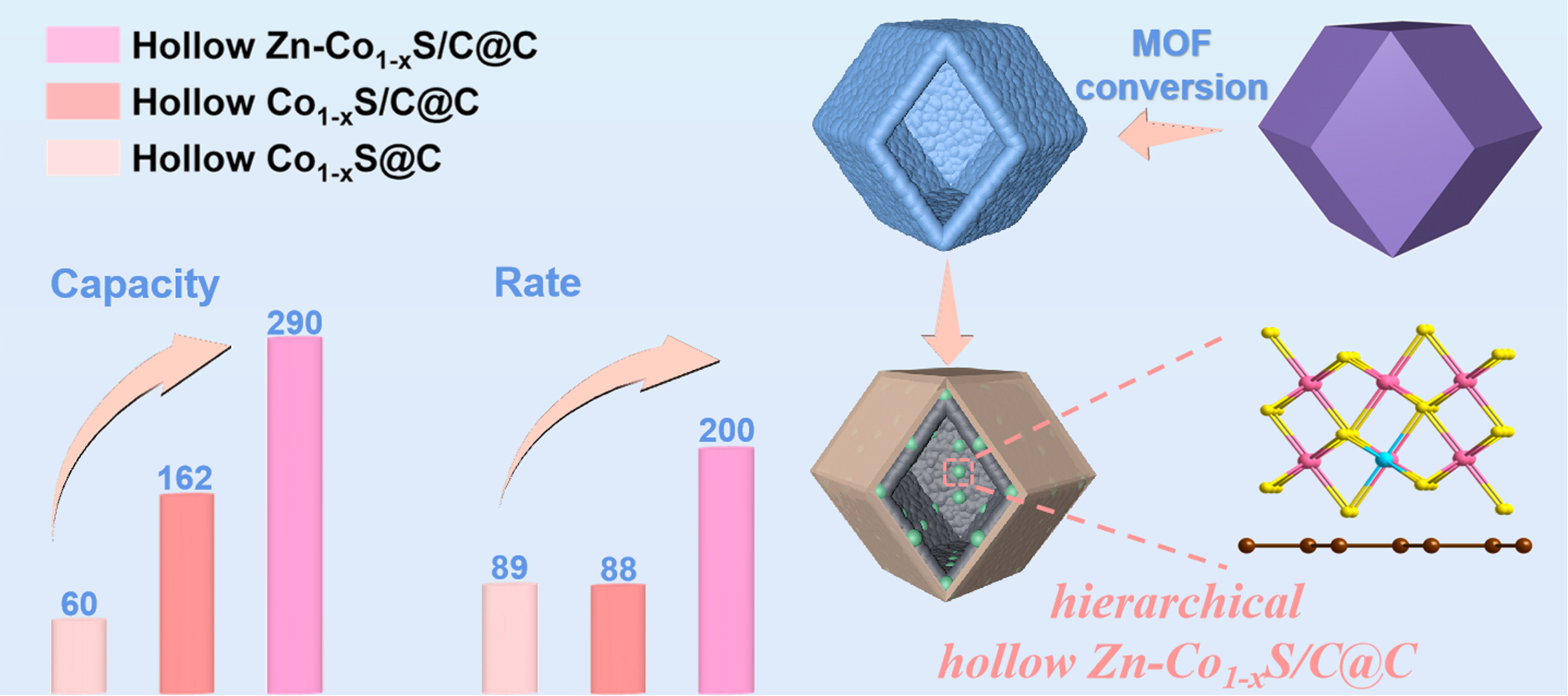 Hollow structured composite can enhance the structural stability of metal sulfide anode by accommodating its volume variation, while the performance is still hindered by its poor electron/ion conductivity. Herein, we develop a hierarchical hollow structure to achieve superior electrochemical performance, from which a MOF-to-MOF conversion is utilized to generate hollow Zn–Co1-xS/C composite followed with additional carbon coating layer. For potassium storage, as-prepared hollow Zn–Co1-xS/C@C composite displays high capacities of 375 mA h g−1 after 100 cycles at 0.2 A g−1 and 201 mA h g−1 after 500 cycles at 1 A g−1. Moreover, it also manifests outstanding rate capability of 200 mA h g−1 at 10 A g−1, outperforming hollow Co1-xS@C and majority of the reported cobalt-based anodes. With illustration by kinetics analysis and theoretical calculation, both of Zn doping and internal carbon matrix are conductive to promote the charge transportation ability of Co1-xS, thus accounting for the good cycling behavior and excellent rate capacity of hierarchical hollow Zn–Co1-xS/C@C composite.