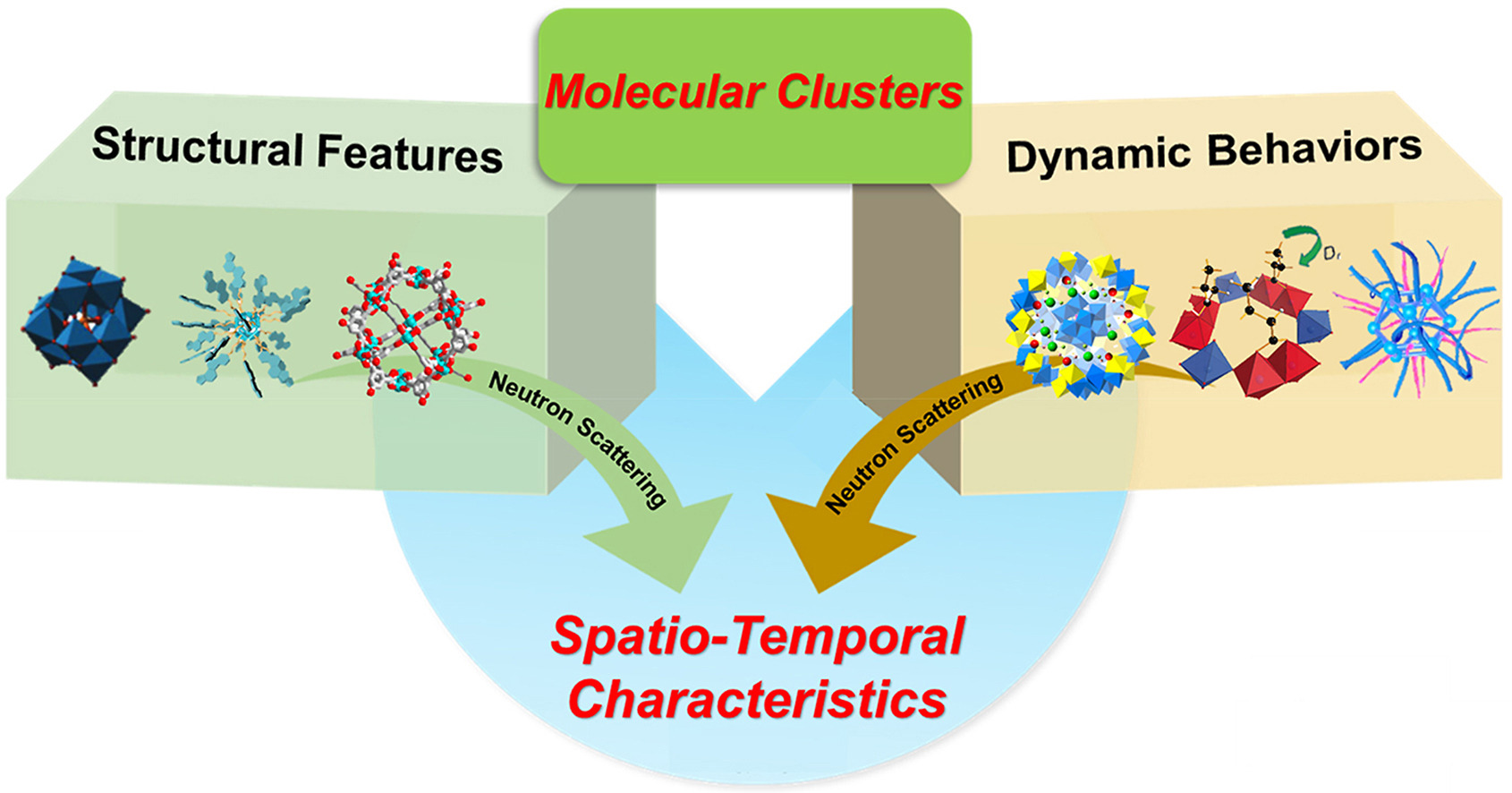 Advanced neutron scattering techniques have the unique advantages of comprehensively characterizing the hierarchical structure and dynamic behavior of molecular clusters (MCs) at a wide range of spatial and temporal scales. Therefore, the application of neutron scattering techniques can provide spatiotemporal information of MCs concerned about both the structure and dynamics topics. This will help us to get insight into their structure-property relationships and guide the rational design of MCs-based functional materials applicable for diverse application scenarios.