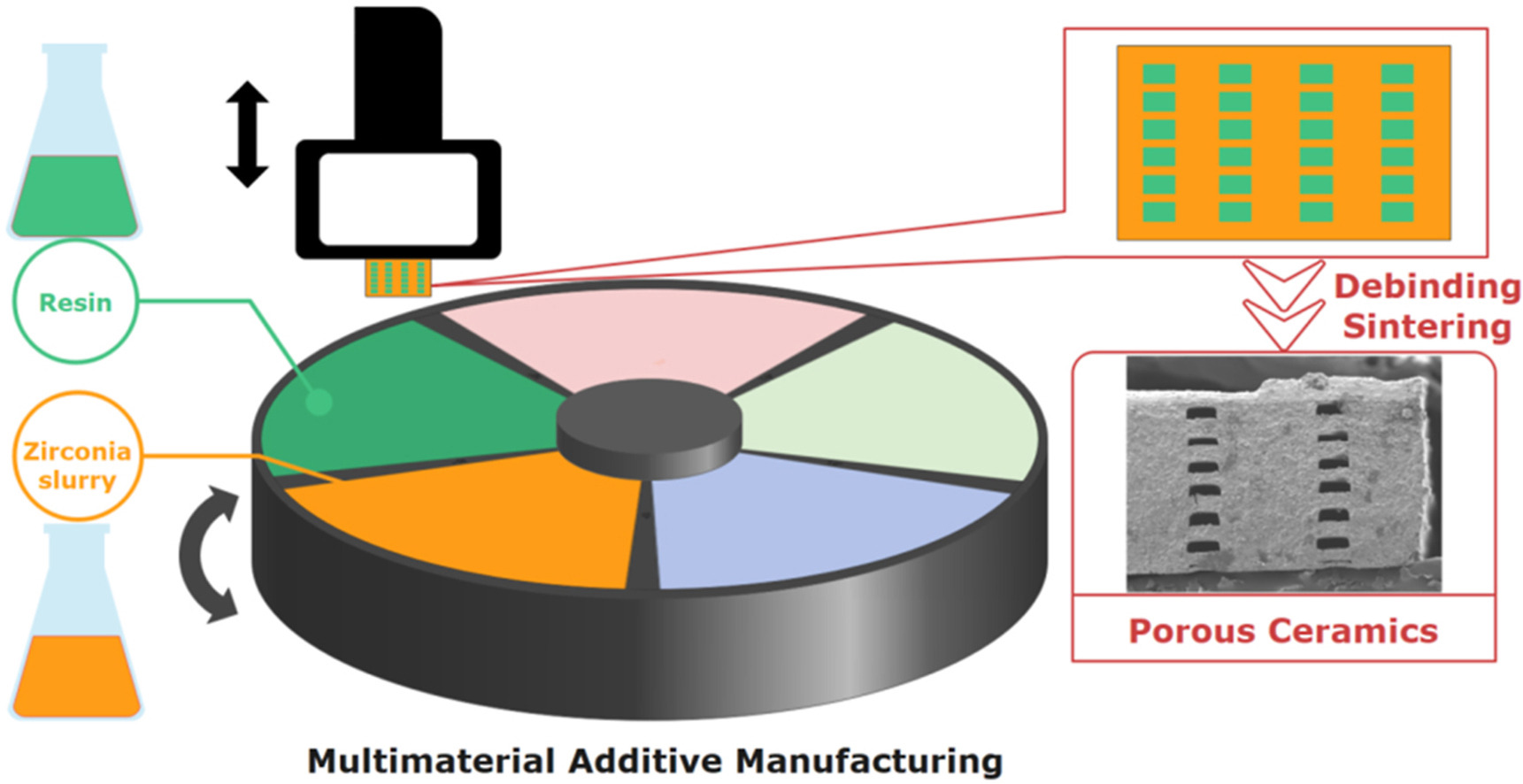 Porous ceramics with a pore size of 60 μ m * 20 μ m was printed using the multi-materials printing method. The pore size was the smallest known ceramic pore size that can be directly printed, especially the pore height of 20 μ m in the longitudinal direction, which cannot be achieved by other ceramic additive manufacturing technologies. The feasibility of multi-materials 3D printing method was verified by sample printing and sintering. Further, the fiber-like effect in resin and ceramic material multi-materials printing was proposed, which enlarged the transverse pore size of the porous ceramics. This method can manufacture porous ceramics with a pore size of < 100 μ m and the pore distribution and structure can be designed. This can benefit product performance and expand application fields. In addition, the proposed printing method is expected to be applied in micro-chemical industries to manufacture ceramic mixers, dispersers, reactors, heat exchangers, ceramic microfluidic chips, and micro-ceramic scaffolds.