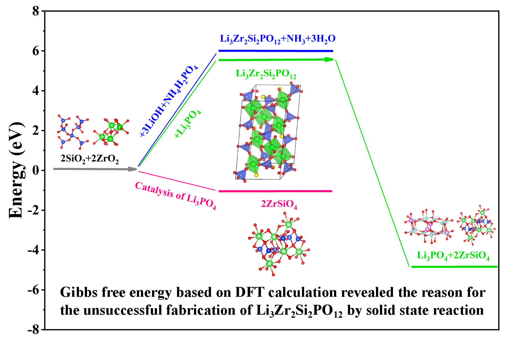 NASICON type Li3Zr2Si2PO12 can be synthesized via cation exchange method with Na3Zr2Si2PO12 as precursor, which retains the skeleton structure and achieves an ionic conductivity higher than 3 mS cm−1 at room temperature. However, large-scale fabrication via cation exchange reaction seems unlikely considering the expensive precursors and complicated preparation process. Herein, the viability of solid-state reaction to prepare Li3Zr2Si2PO12 is explored, which has important implication for its industrialization. The sintering was conducted using the raw materials of LiOH, SiO2, ZrO2 and NH4H2PO4 with the nominal stoichiometric ratio of Li3Zr2Si2PO12. The results show that the final product is a Li3PO4·2ZrSiO4 composite with negligible Li+ conductivity, other than the expected Li3Zr2Si2PO12 with high Li+ conductivity. Combined with thermodynamic calculations based on density functional theory (DFT), the competition between Li3PO4·2ZrSiO4 and Li3Zr2Si2PO12 with NASICON phase is analyzed. It was found that the formation energy (ΔG) of Li3PO4·2ZrSiO4 is lower than that of Li3Zr2Si2PO12. In addition, the decomposition of Li3Zr2Si2PO12 with Li3PO4·2ZrSiO4 as products is a thermodynamically spontaneous reaction. The influences related to the coordination structures on the structural stability of NZSP are discussed as well. These results demonstrate that the fabrication of Li3Zr2Si2PO12 through high-temperature sintering is difficult, and the development of a synthetic method with mild conditions is essential for the Li3Zr2Si2PO12 preparation.