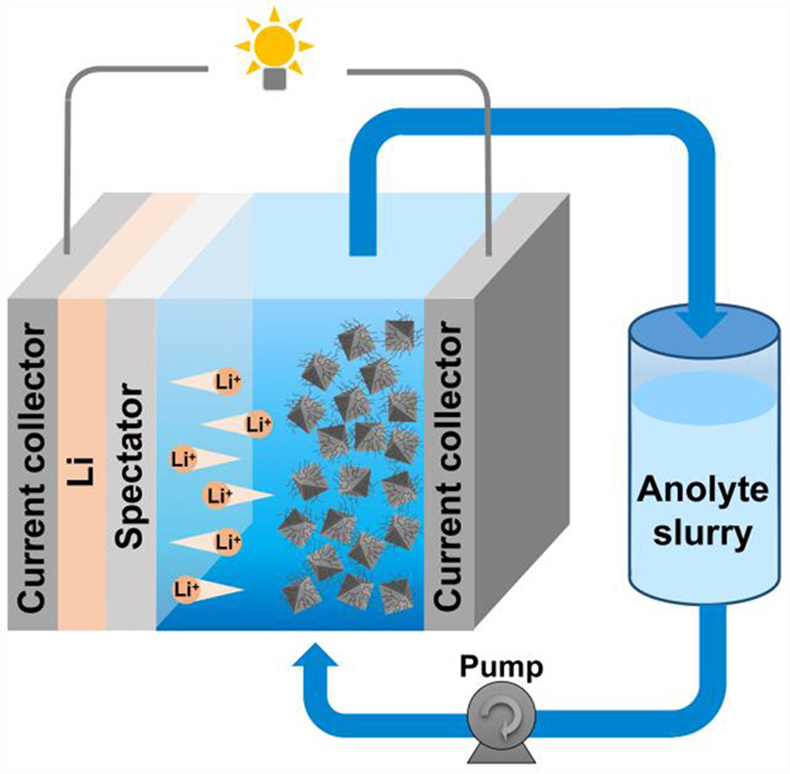 Lithium-based semi-solid flow battery (LSSFB) is expected to be applied in the field of large-scale energy storage. However, the rate performance of LSSFBs is unsatisfied due to the poor conductivity of active materials and the unstable contact with conductive additives. Herein, carbon coated MnO quantum dots derived from MIL-100(Mn) were prepared. Such MnO quantum dots and carbon framework composite can not only increase the reactive active sites of MnO, but also avoid their agglomeration in the lithiation/delithiation process. Furthermore, the carbon framework and multi-walled carbon nanotubes (MWCNTs) are conducive to the rapid transport of electrons and can inhibit the volume expansion of MnO, achieving the high-rate performance and long cycling life. Moreover, MWCNTs can increase the suspension of the material and ensure the long-term stability of the slurry. These advantages endow the LSSFBs with high rate and long cycling performance. This work provides a promising strategy for the preparation of high-rate slurry electrode materials.