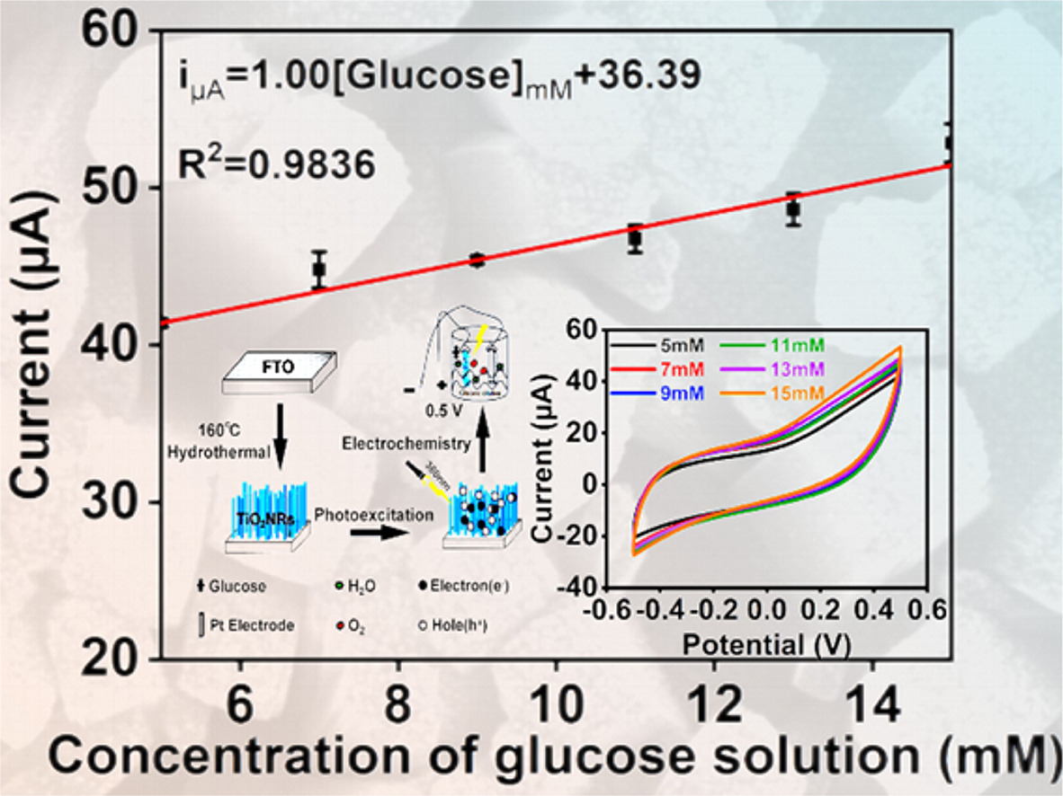A simple one-step hydrothermal method is used to prepare an enzyme-free photoelectric combined glucose sensor based on TiO2NRs/FTO with low cost, sample two-electrode, and excellent detection. Under 380 nm light (0.5 mW cm−2) irradiation and a positive voltage, holes are accumulated on TiO2NRs surface, catalyzing glucose and forming a photocurrent without the need for an enzyme, such as Glucose oxidase (GOx). The designed sensor exhibits high sensitivity (about 0.96 μA mM−1 cm−2, without GOx) and excellent linear relationship in the glucose concentration range of 5–15 mML−1. The prepared glucose sensor performs better with a sensitivity of 1.48 μA mM−1 cm−2 when a certain amount of GOx is mixed in the detected solution. In addition, the sensor has excellent anti-interference resistance to non-reducing chitosan and reducing ascorbic acid with short response time (less than 5 s); thus, it can be used in quick detection with a double electrode system. This sensing device has the advantages of simple fabrication, easy storage, and reusability; therefore, it can be very promising in the portable and rapid monitoring of human blood glucose levels.