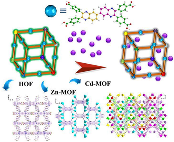 Crystalline materials with well-defined structures and ordered molecular arrays can provide a new research platform to fabricate new smart materials with excellent stimulus response properties. Among them, Luminescent Metal-Organic Frameworks (LMOFs) and Hydrogen-bonding Organic Frameworks (HOFs) show great promise for fluorescence detection to different pollutants. In order to further extend the smart sensing frameworks and enhance the relevant sensing performance, the present work specifically selects 4,4′,4″,4‴-([6,6′-biquinoxaline]-2,2′,3,3′-tetrayl)tetrabenzoic acid (H4L) consisting of the bisquinoxaline functional group as an optical response group, and HOF (HUST-25, HUST = Huazhong University of Science and Technology), Zn-MOF (HUST-26), and Cd-MOF (HUST-27) were successfully obtained. HOF could achieve the fluorescence recognition of Fe3+, MnO4−, Cr2O72−, p-nitrotoluene (4-NP), 2,4,6-trinitrotoluene (TNP) and metronidazole (MDZ). The detection range of Zn-MOF constructed using Zn ions was similar to that of HOF, but the detection sensitivity of metal cations was significantly improved. Although Cd-MOF formed a six-fold interpenetrating structure, it was still able to retain a large pore structure. The dense stacking structure increases the quinoxaline density, which effectively expanded the sensitivity and detection range of fluorescence sensing. Therefore, Cd-MOF showed better detection for nitro explosives, antibiotics, and organic small molecules with ketone groups. For example, compared to the previous literatures, Cd-MOF has a larger Ksv value for the nitro-explosive nitrobenzene (NB), indicating the very high detection sensitivity. The series frameworks can present excellent sensing properties mainly because the functional primitives can be uniformly distributed in the skeleton of the crystalline materials, forming an ordered molecular array that enables the efficient energy transfer between the external stimulus signal and the response function sites. The related results indicate that the introduction of bisquinoxaline groups with a large degree of conjugation and excellent optical properties into the frameworks can be one of the effective strategies to construct highly sensitive and universal fluorescence sensing crystalline materials.