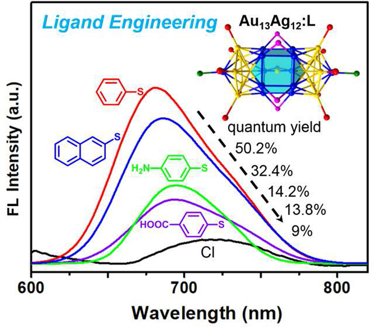 by the functional side groups is found and the [Au13Ag12-(PPh3)10(SPh)5Cl2]2+ nanoclusters gave the highest quantum yield (~50.4%) among these Au13Ag12