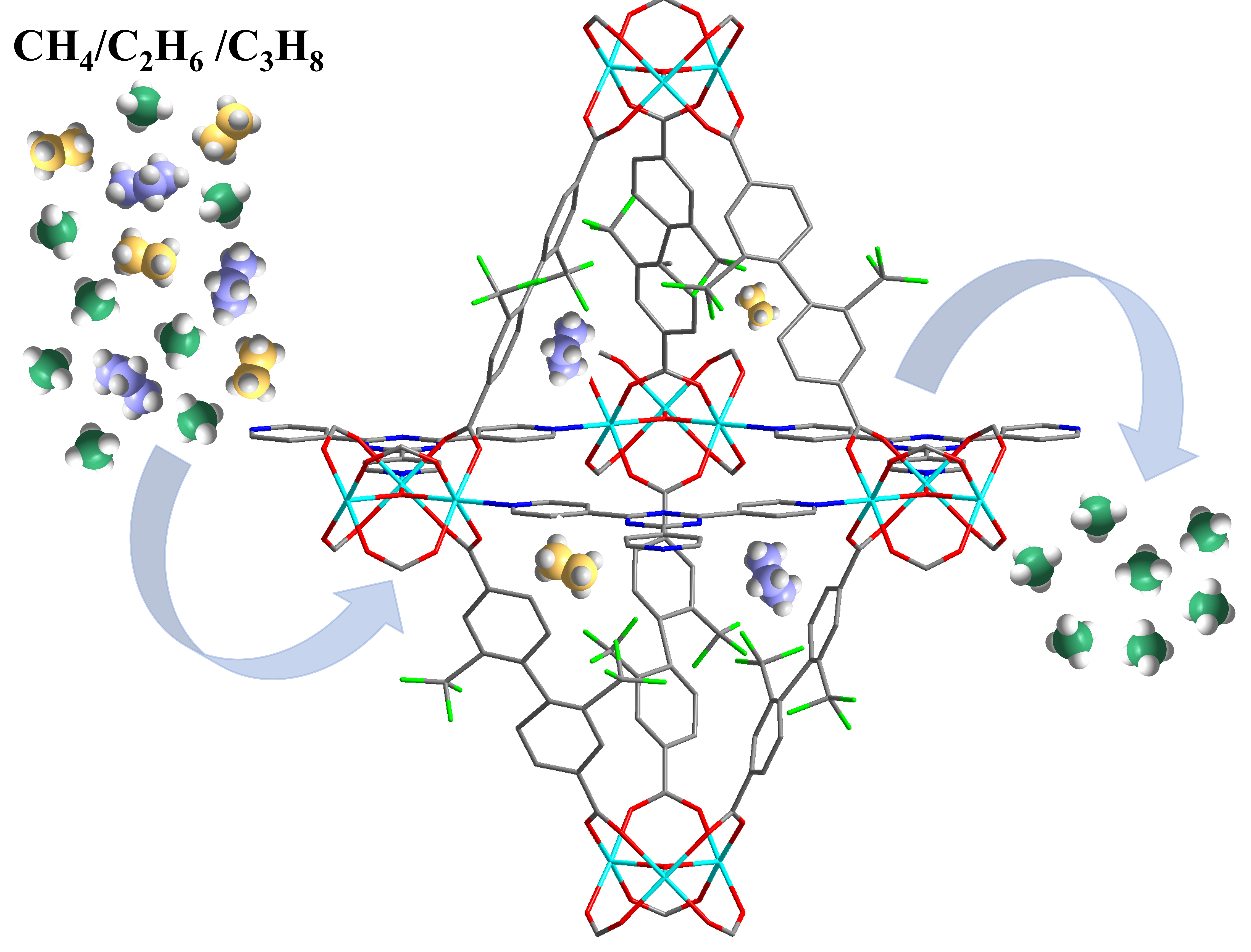 Herein we present a fluorinated metal-organic framework of {(Me2NH2)[Ni3(μ3-OH)(CF3-BPDC-CF3)3(tpt)]}n (1) constructed from 2,2'-bis(trifluoromethyl)biphenyl-4,4'-dicarboxylic (CF3-BPDC-CF32‒) and 2,4,6-tri(4-pyridyl)-1,3,5-triazine (tpt) ligands, which is developed for separating propane (C3H8) and ethane (C2H6) from natural gas. Compound 1 preferentially adsorbs C3H8 and C2H6 over CH4 demonstrated by gas adsorption experiments. The presence of trifluoromethyl groups on the biphenyl-4,4'-dicarboxylic ligands facilitates the highly polarized micropore environments for compound 1, thus providing suitable micorpores for capturing the C3H8 and C2H6 molecules with larger polarizabilities and sizes compared to CH4 molecule. The dynamic mixture breakthrough experiments showed that compound 1 can separate C3H8 and C2H6 from the ternary CH4/C2H6/C3H8 mixtures efficiently, endowing compound 1 with excellent methane purification ability.