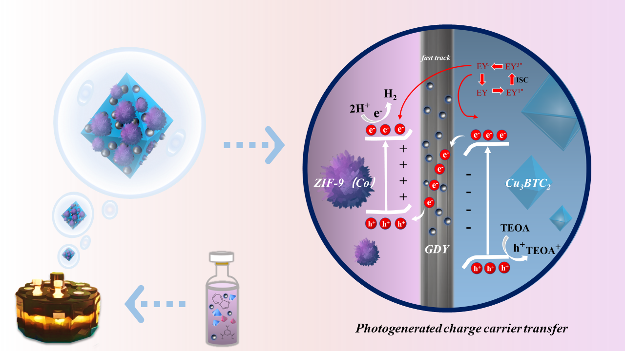 Interface engineering of photocatalysts is an effective way to enhance their photocatalytic activity. In this work, the MOF-on-MOF strategy was used to construct the ZIF-9(Co)/Cu3BTC2 photocatalyst in situ. Moreover, graphdiyne, possessing an inherent capability to facilitate rapid electron transfer at the interface, has been introduced into the ZIF-9(Co)/Cu3BTC2 interface to regulate the interfacial carrier migration. The photogenerated carrier transfer capability has been significantly enhanced by the interfacial synergy, while retaining the original active sites and high specific surface area. The exceptional efficiency performance of the composite catalyst under identical conditions could be attributed to the following two key factors: (i) The interfacial S-scheme heterojunction in ZIF-9(Co)/Cu3BTC2 provides the composite catalyst with strong reduction activity, facilitating the involvement of additional electrons in the reduction reaction through bended bands and an internal electric field. (ii) Carrier dynamics analysis shows that graphdiyne, as an electron transport layer, accelerates the charge migration rate at the S-scheme heterojunction interface through the electron relay effect. The incorporation of graphdiyne greatly improves the catalytic activity of MOFs and also demonstrates the great potential of graphdiyne in photocatalysis. This work provides a feasible idea for the interface engineering design of graphdiyne in photocatalysts.