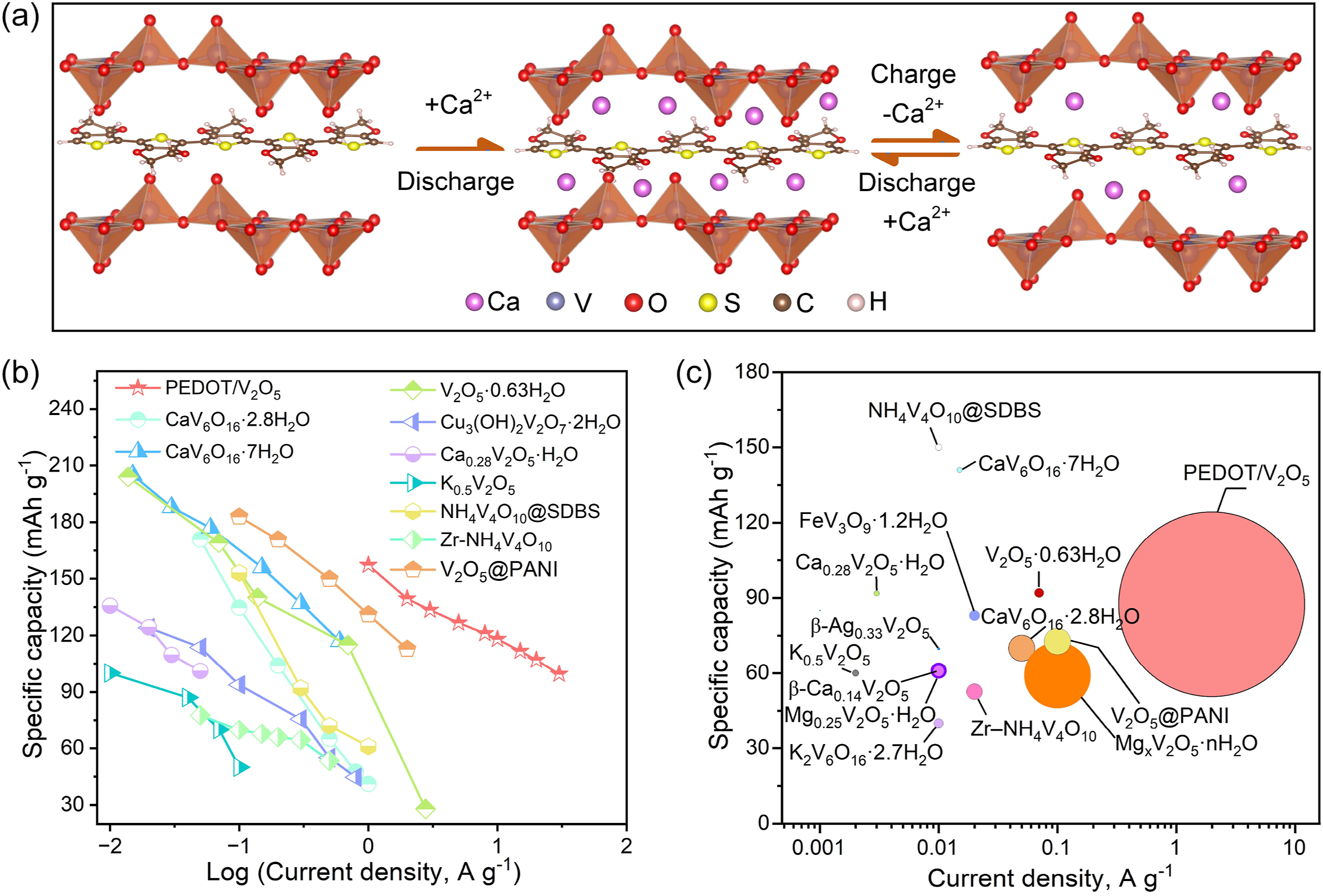In conclusion, LVOs have been shown the feasibility as Ca2+ host materials, but it is worthwhile to consider how to accelerate the ion and electron transfer rates and enhance structural stability simultaneously with a view to realizing high specific capacities, long cycling stability and fast charging/discharging capability (Fig. 2). “Every cloud has a silver lining”. Although improvement strategies, such as interlayer engineering, nanostructural design, etc., have exhibited significant enhancement, more attention should be paid to their negative effects and operation difficulties. Additionally, we would like to emphasize that LVOs have been widely used in other multivalent ion (e.g., Zn2+, Al2+) batteries, but the experiences and knowledge obtained cannot be directly applied to CIBs because the discrepancies of various multivalent ions like charge density and ionic radius may result in significantly different charge storage behaviors regardless of the physical/chemical similarities. As an emerging battery technology, CIBs also remain elusory issues in anode/electrolyte interphase. The surface of the Ca metal anode is easily passivated in most conventional electrolytes with sluggish and poorly reversible Ca stripping/plating behaviors. The modification of cathode materials is suggested to be in combination with electrolyte design to achieve further improvements in CIBs.
